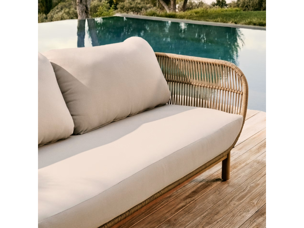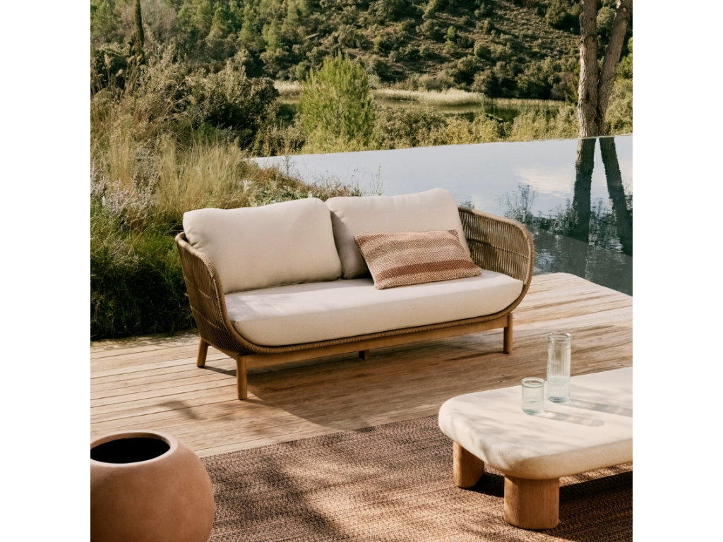 Stylová zahradní pohovka Kave Home Catalina je odolná vůči UV záření a proto je vhodná nejen pro použití v interiéru – umístit ji můžete také do krytého exteriéru. Skvěle se hodí na terasu nebo pod pergolu, kde si s ní užijete chvíle odpočinku v maximálním pohodlí. Doplnit ji můžete křeslem nebo lenoškou ze stejnojmenné série. Pohovka stojí na stabilní podnoži z masivního akátového dřeva s certifikátem FSC, které pochází z udržitelných lesů. Její konstrukce je tvořena výpletem z polyesterového lana, který je doplněn polštáři se snímatelnými potahy.