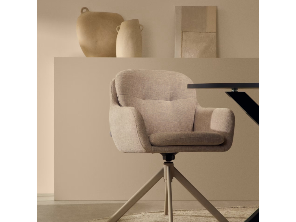 Otočná židle Kave Home Lexa najde využití v pracovně i u jídelního stolu. Je čalouněná žinylkou v elegantním béžovém odstínu, která se pyšní OEKO TEX certifikací pro ekologicky bezpečnou a odpovědnou výrobu. Její prostorný sedák s opěradlem a vyššími područkami vám poskytne pohodlí, které si zamilujete, a díky otočné podnoži budete moct mít dokonalý přehled o dění v místnosti. Dopřejte vašemu interiéru tuto elegantní designovku – k dostání je také v tmavě zelené barvě.