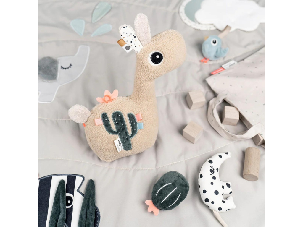 Interaktivní hračka od značky Done by Deer je vhodná pro všechna zvídavá dítka, která rádi prozkoumávají svět. Jakmile se miminko překulí na bříško, bude lama Lalee jeho nejlepším přítelem. V zrcátku, které má lama na sobě, bude děťátko objevovat a prozkoumávat svoji tvářičku. Pro zvědavé dětské prstíky jsou tady látkové nášivky s různými texturami a barvami, nebo roztomilá ouška s barevnými puntíky. Písek ve výplni zajistí, že lama bude stát na místě, aniž by se převrátila nebo spadla.