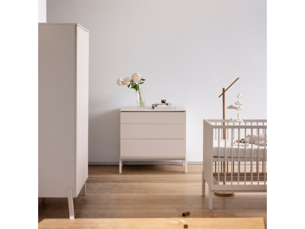 Komoda Ashi představuje vytříbený styl a pyšní se jak estetickou, tak praktickou funkcí. Minimalistickou konstrukci, vyrobenou z laminované dřevotřísky, doplňuje masivní podnož z bukového dřeva. Tři praktické zásuvky skvěle poslouží jako úložný prostor například na oblečení, hračky či přebalovací doplňky. Volné místo na komodě lze pak využít na různé dekorace, nebo doplnit o přebalovací nástavbu od značky Quax a rázem tak získat přebalovací pult.