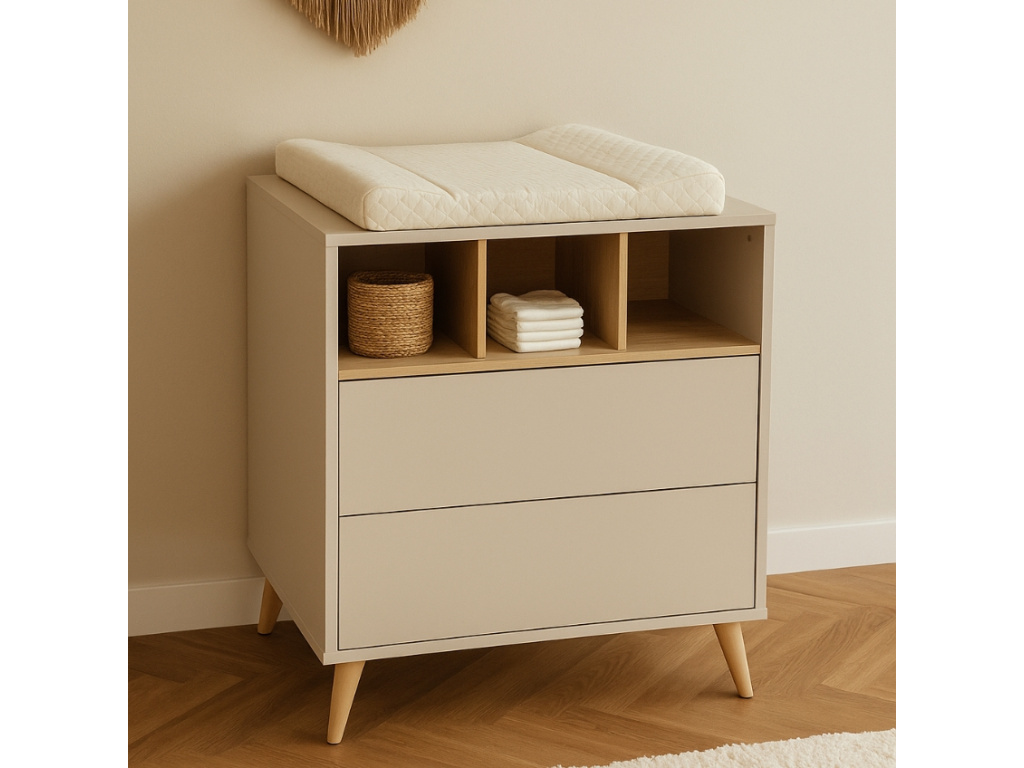 Nedílnou součástí každého pokoje pro miminko je přebalovací pult. Značka Quax přichází s řadou Loft, která vás zaujme nejen svým minimalistickým designem, ale také praktičností a funkčností. Korpus je kompletně vyrobený z laminátu v něžné béžové barvě, která v kombinaci s masivní bukovou podnoží a stejně zbarvenými přihrádkami vytváří jemný a vzdušný kontrast. Komoda disponuje 3 otevřenými přihrádkami pro snadnější přístup k věcem, které potřebujete mít při přebalování po ruce. Dále disponuje 2 prostornými zásuvkami, které bohatě postačí pro uložení oblečení pro vaše miminko. Komodu lze využít samostatně nebo při dokoupení nástavby se z ní rázem stane přebalovací pult. Doporučujeme kombinaci více prvků z řady Loft, abyste vytvořili dokonalý kontrast a souhru v interiéru. Komoda Loft se skvěle hodí do minimalistických či skandinávských interiérů.