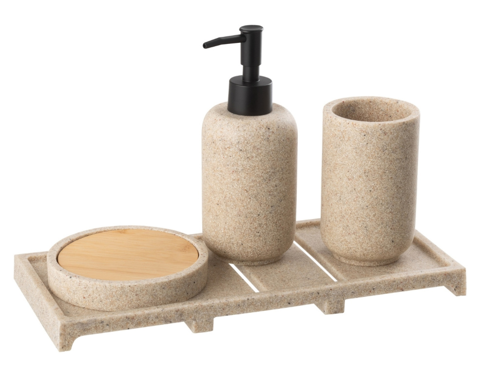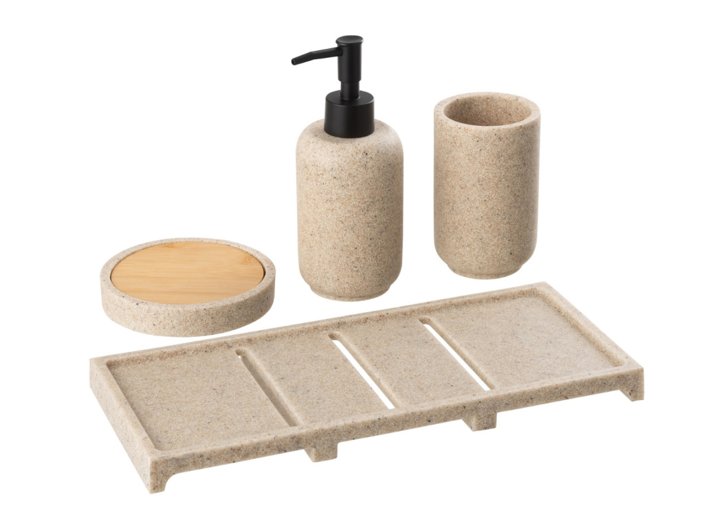 Sada s dávkovačem na mýdlo Hannie vnese do vaší koupelny přírodní eleganci a moderní design. Praktický dávkovač s černou pumpičkou usnadní každodenní hygienu a působí stylově v kontrastu se světlým kameninovým vzhledem. Pohár na kartáčky i podložka na mýdlo vytvářejí harmonický celek, který dodává koupelně upravený a čistý dojem. Díky podnosu zůstane vše pohromadě a vaše umyvadlová deska bude vždy působit organizovaně. Tento kousek kombinuje funkčnost s estetikou a stane se oblíbeným doplňkem vašeho každodenního rituálu.