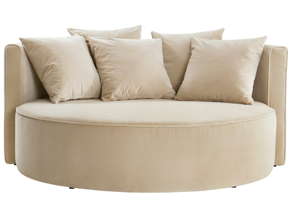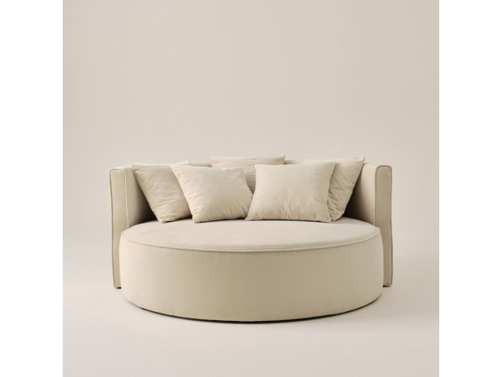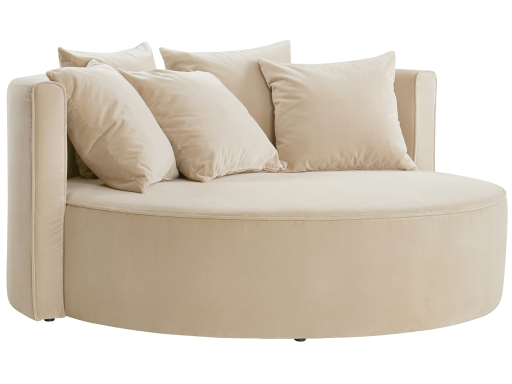 Objevte útulnost a styl s kulatou dvoumístnou pohovkou WYOMING TEDDY. Tato elegantní designovka je potažena hebkou sametovou látkou, která jí dodává hřejivý a moderní vzhled. Součástí balení je 5 dekorativních polštářů s výplní z peří a vláknitých kuliček, které ještě umocňují pohodlí, a navíc mají snímatelné povlaky se zipem, takže je jejich údržba snadnější. Odolnost čalounění 80.000 Martindale, což zaručuje dlouhou životnost a odolnost proti opotřebení. Díky kulatému tvaru a sametovému čalounění představuje WYOMING dokonalé místo pro odpočinek – ať už se do ní zachumláte sami, nebo ji budete sdílet s někým blízkým!