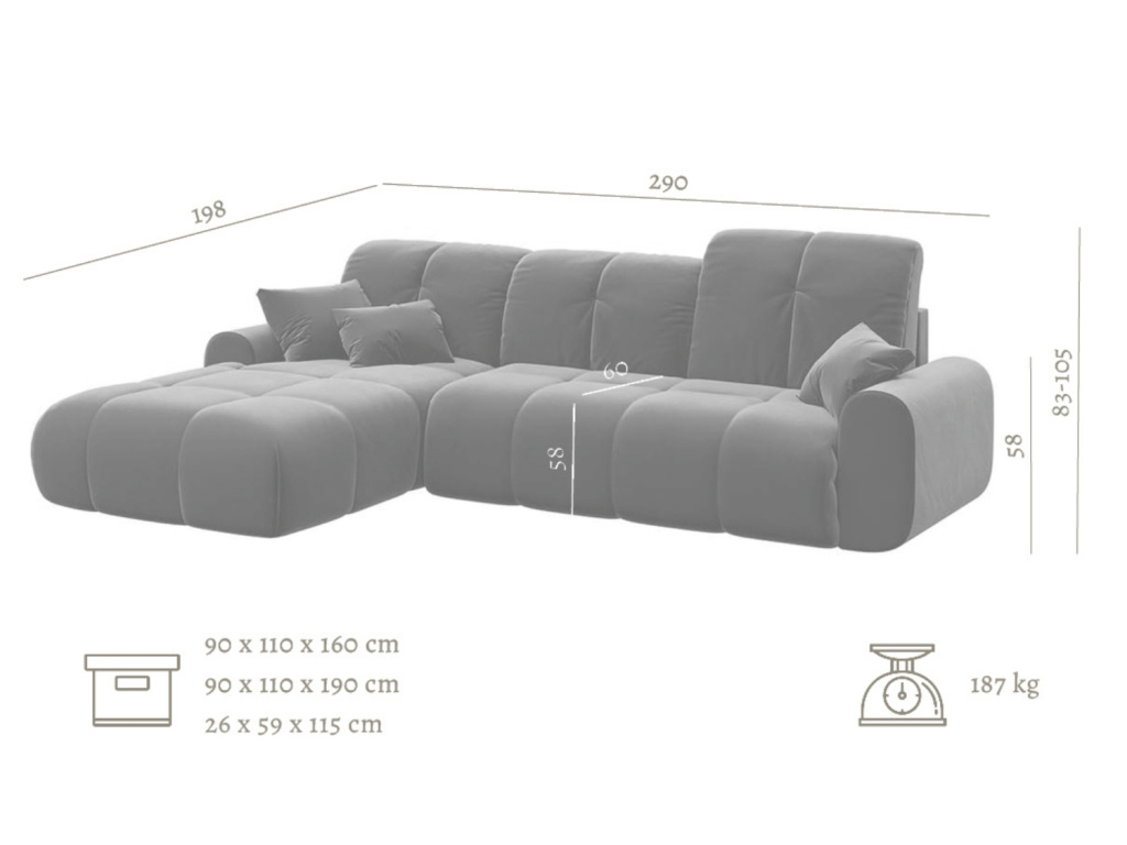 Rohová pohovka Tous představuje promyšlené spojení elegantního designu, pohodlí a vysoce kvalitního zpracování. Nadčasové linie, pečlivě tvarované sedáky s výrazným prošíváním a široké opěrky zajišťují, že se Tous stane stylovým a plně funkčním prvkem každého interiéru. Exkluzivní sametové čalounění s jemným leskem dodává celku nádech luxusu a je příjemný na dotek. Celek doplňuje nastavitelná opěrka hlavy, díky níž si dopřejete maximální pohodlí – ať už relaxujete po náročném dni, užíváte si filmový večer nebo trávíte čas s přáteli. Tous je jednoduše pohovka, která dokonale spojuje styl, relax i praktičnost v jeden výjimečný celek.