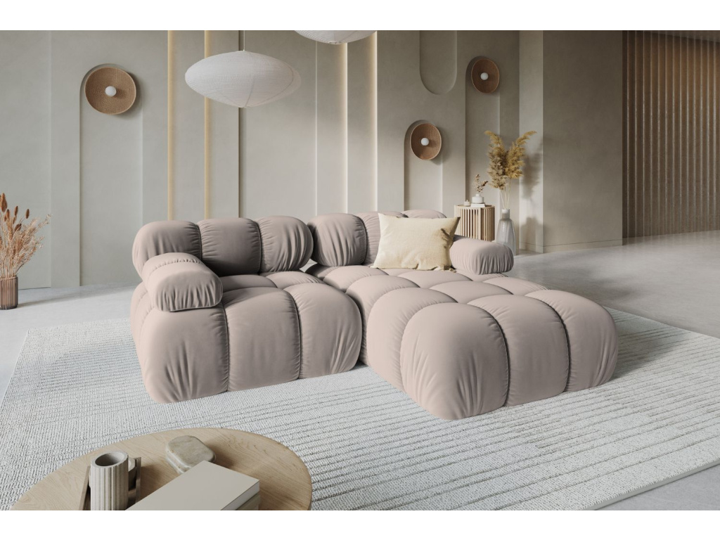 Rohová trojmístná pohovka Bellis spojuje ikonický design s maximálním pohodlím. Její elegantní zaoblené linie a propracované čalounění vdechnou interiéru jedinečný styl inspirovaný retro estetikou 70. let, doplněnou o moderní vzhled. Pružinové moduly zajišťují ideální rovnováhu mezi měkkostí a oporou, takže sezení je pohodlné i při každodenním používání. Pohovka je čalouněna kvalitní tkaninou s jemným leskem, která imituje samet, je hebká na dotek a zároveň odolná proti oděru. Látka splňuje bezpečnostní normy a je vhodný pro dlouhodobé používání. K dispozici je však i v dalších typech látek a barevných provedeních, takže si ji snadno přizpůsobíte svému interiéru. Sezení Bellis promění váš obývací pokoj v elegantní a útulné místo. Pro harmonické doladění doporučujeme pohovku kombinovat s masivním nebo skleněným konferenčním stolkem a jemnými dekorativními polštáři.