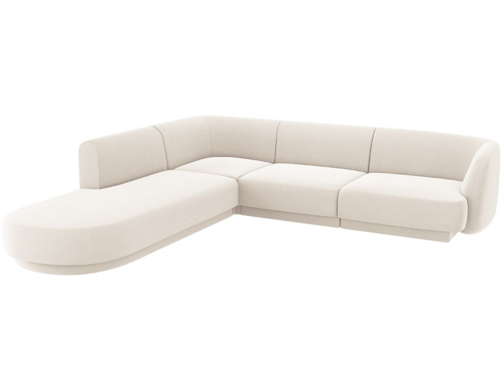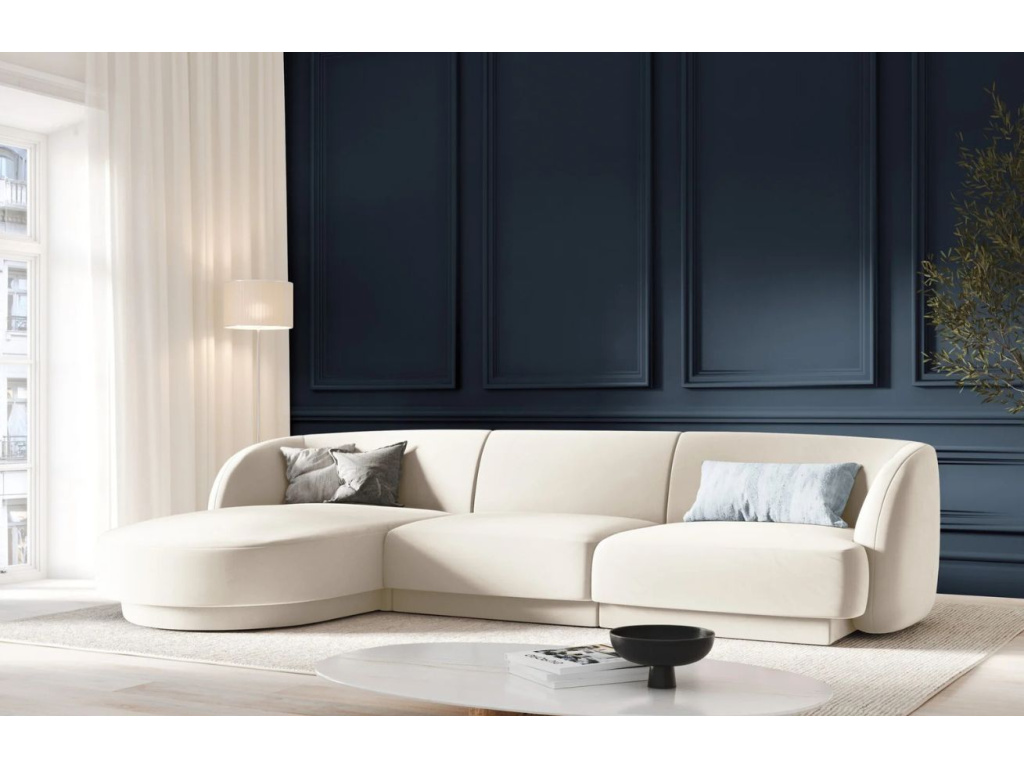 Šestimístnou rohovou pohovku Miley od značky Micadoni si zamilujete! Její obloukovitě tvarované opěradlo vybízí k tomu, abyste se na chvíli pohodlně usadili. Mírně zapuštěná základna dodává sezení vznášející se charakter, který dotváří vzhled připomínající oblak. Měkký, odolný a na pohled příjemný samet poskytuje nábytku lákavý vzhled, který vnese do místnosti záři a pocit sofistikovanosti. Pohovka je ideální volbou do interiéru v moderním nebo skandinávském stylu. K pohovce je možné přikoupit další produkty z kolekce Miley. Díky tomu si můžete vytvořit sedací soupravu, kterou je vhodné kombinovat se skleněným nebo dřevěným konferenčním stolkem.