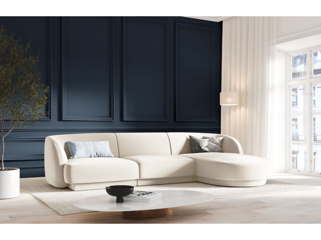 Čtyřmístnou rohovou pohovku Miley od značky Micadoni si zamilujete! Její obloukovitě tvarované opěradlo vybízí k tomu, abyste se na chvíli pohodlně usadili. Díky mírně zapuštěné základně dodává sezení vznášející se charakter, který dotváří vzhled připomínající oblak. Měkký, odolný a na pohled příjemný samet poskytuje nábytku lákavý vzhled, který vnese do místnosti záři a pocit sofistikovanosti. Pohovka je ideální volbou do interiéru v moderním nebo skandinávském stylu. K pohovce je možné přikoupit další produkty z kolekce Miley. Díky tomu si můžete vytvořit sedací soupravu, kterou je vhodné kombinovat se skleněným nebo dřevěným konferenčním stolkem.