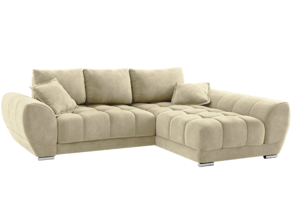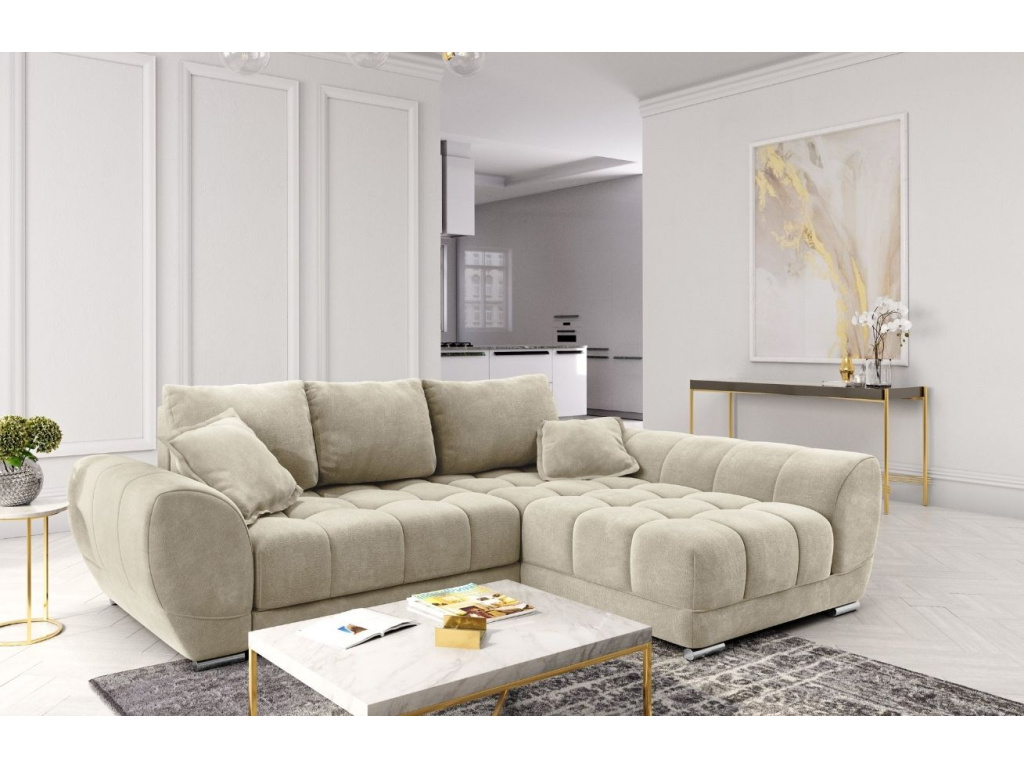 Designová čtyřmístná rohová pohovka Nuage od výrobce Windsor & Co se díky elegantním liniím a jemnému sametovému čalounění v béžové barvě stane ideálním místem pro odpočinek, posezení s rodinou, přáteli nebo romantické večery ve dvou. Atraktivní prošívání a minimalistická kovová podnož v kombinaci s látkou příjemnou na dotek dodá vašemu obývacímu pokoji jedinečný styl. Maximální komfort zajistí dva dekorativní polštářky. Látka disponuje voděodolnou technologií, je tedy vhodná pro rodiny s dětmi a domácími mazlíčky. Díky vlastnostem se však hodí i do komerčních prostor jako jsou hotelové haly, apod. Pohovka je rozkládací, rázem se z ní stane pohodlné lůžko pro vaše hosty.