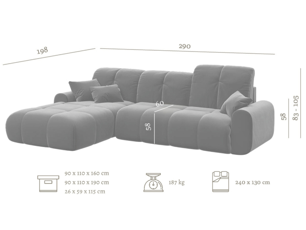 | Rozpětí pohovky: | od 251 cm |