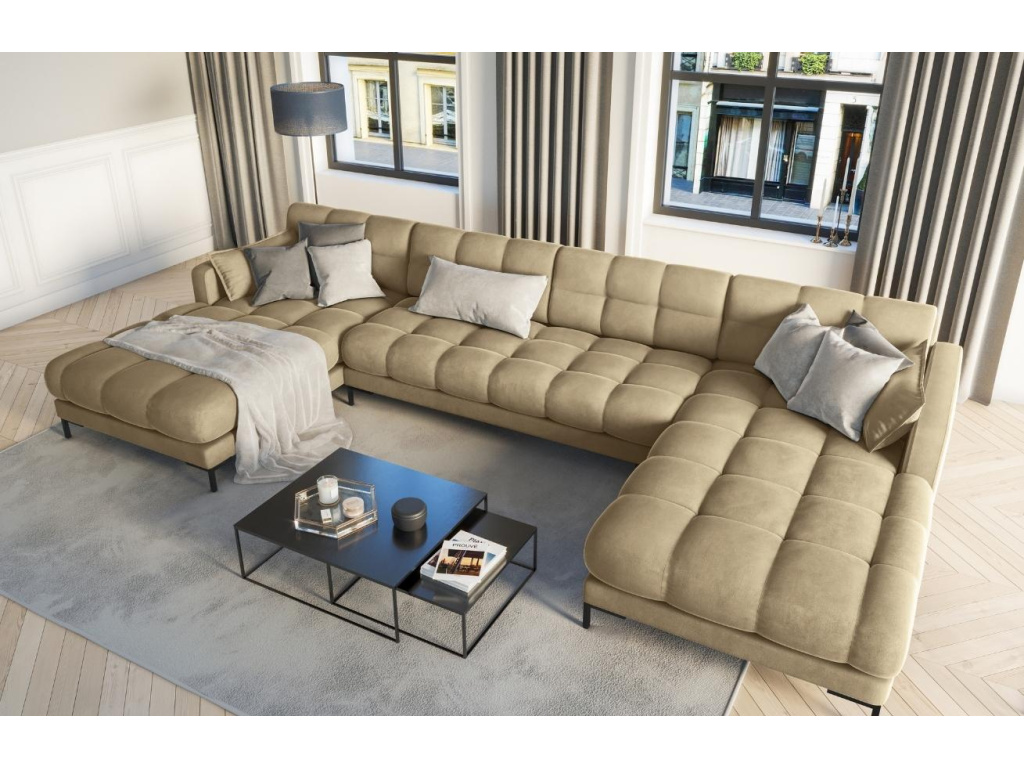 Elegantní šestimístná rohová pohovka MICADONI MAMAIA zaujme na první pohled svým nadýchaným vzhledem. Velmi příjemné sametové čalounění v béžové barvě a kovová podnož vytváří kontrast, který interiéru dodá elegantní vzhled a nádech luxusu. Díky zajímavému prošívání vzniká jemný design, který do vašeho domova vnese lehkost a styl. Opěrné polštářky zvednou úroveň vašeho odpočinku o stupeň výš. Díky praktickému tvaru do písmene U získáte rovnoměrně rozdělená místa k odpočinku. Nechte se obklopit komfortem ve společnosti produktů Mamaia.