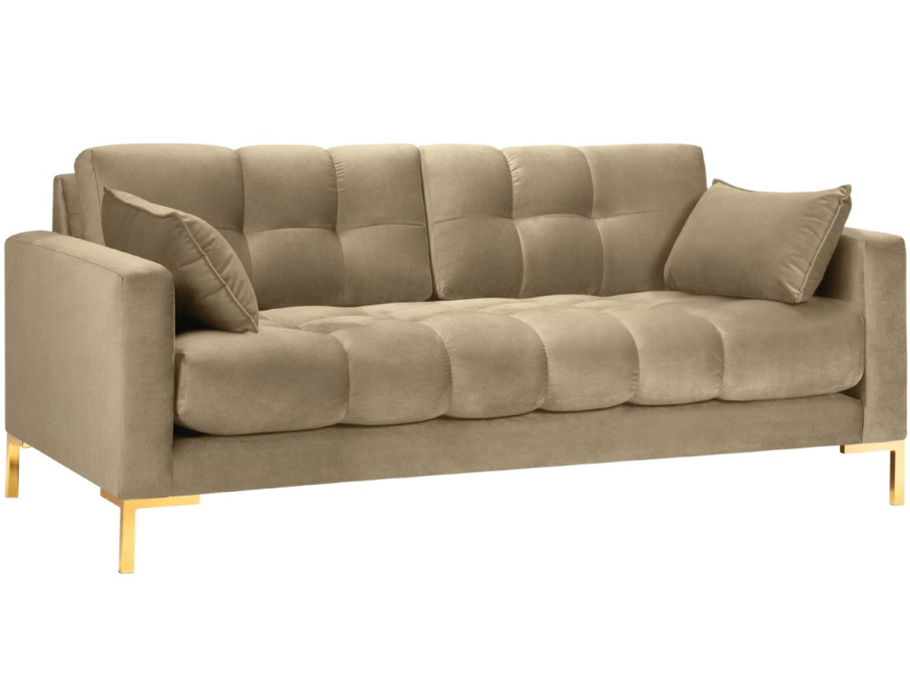 Elegantní třímístná pohovka Mamaia od značky MICADONI zaujme na první pohled svým nadýchaným vzhledem. Velmi příjemné sametové čalounění a zlatá kovová podnož vytváří kontrast, který interiéru dodá elegantní vzhled a nádech luxusu. Díky zajímavému prošívání vzniká jemný design, který do vašeho domova vnese lehkost a styl. Opěrné polštářky zvednou úroveň vašeho odpočinku o stupeň výš. Nechte se obklopit komfortem ve společnosti pohovky Mamaia.