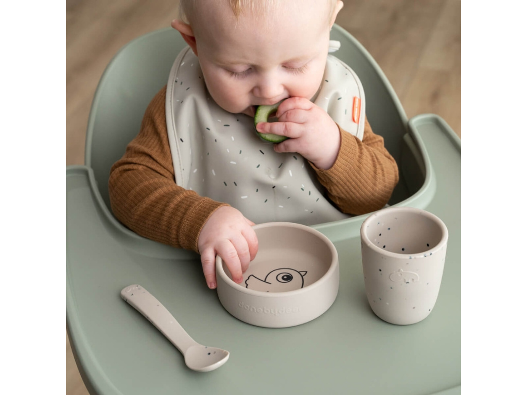 Silikonová jídelní sada od Done by Deer je skvělou volbou pro všechny malé jedlíky, kteří se učí jíst samostatně. Protiskluzová miska má vyvýšené okraje, které umožní snadné nabírání jídla. Hrneček a lžička jsou lehce uchopitelné do malé dětské ručičky. Celá sada je v krásném béžovém provedení s drobnými konfety a jednoduchý design podtrhuje roztomilý ptáček Birdee.