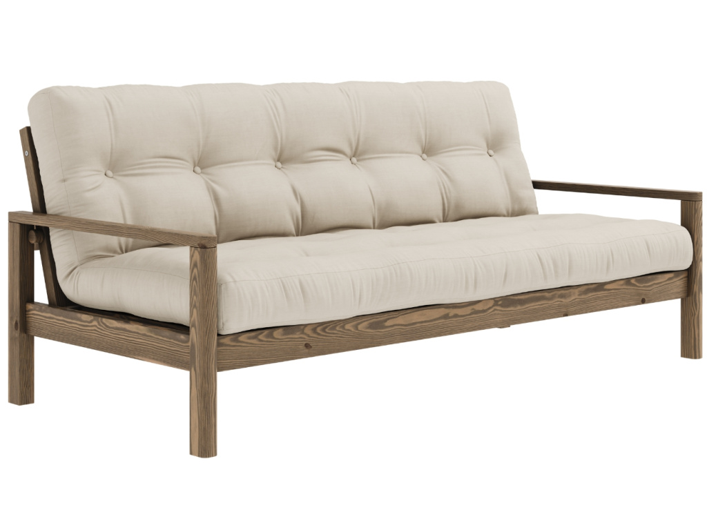Pohovka nebo postel? Trojmístná rozkládací pohovka Knob od dánské značky Karup Design umí být obojím! Pod dřevěnými područkami se nachází dva nenápadné úchyty, které lze snadno odšroubovat a vy tak během chvilky získáte pohodlné lůžko pro vás nebo vaše hosty. Konstrukce z masivního borovicového dřeva s FSC certifikací je doplněna kvalitní 14cm futonovou matraci, která v sobě kombinuje recyklovaná vlákna a 4 cm pěny. Pohovka Knob fantasticky zapadne do skandinávských a japonských stylů interiérů, do kterých vnese jednoduchost, eleganci a ryzí funkčnost. Představuje skvělé řešení zejména pro menší prostory, do kterých přinese další místo na spaní. Vybrat si ji můžete v další barvě konstrukce či v mnoha barvách matrací.