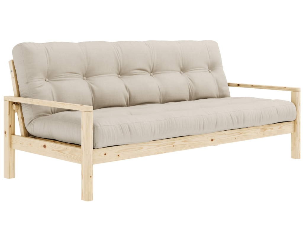 Pohovka nebo postel? Trojmístná rozkládací pohovka Knob od dánské značky Karup Design umí být obojím! Pod dřevěnými područkami se nachází dva nenápadné úchyty, které lze snadno odšroubovat a vy tak během chvilky získáte pohodlné lůžko pro vás nebo vaše hosty. Konstrukce z masivního borovicového dřeva s FSC certifikací je doplněna kvalitní 14cm futonovou matraci, která v sobě kombinuje recyklovaná vlákna a 4 cm pěny. Pohovka Knob fantasticky zapadne do skandinávských a japonských stylů interiérů, do kterých vnese jednoduchost, eleganci a ryzí funkčnost. Představuje skvělé řešení zejména pro menší prostory, do kterých přinese další místo na spaní. Vybrat si ji můžete v další barvě konstrukce či v mnoha barvách matrací.