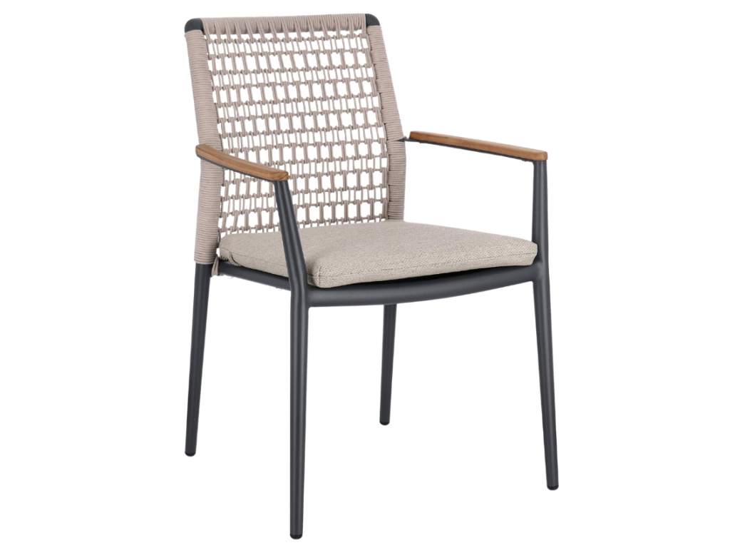 Židle Maddox vnese na vaši terasu či balkon lehkost středomořské atmosféry. Elegantní výplet z olefinového lana je nejen vizuálně poutavý, ale i odolný vůči povětrnostním vlivům. Rám z práškově lakovaného hliníku v kombinaci s teakovými detaily na područkách dodává židli jemný přírodní akcent. Odnímatelný sedák s vodoodpudivou úpravou se postará o pohodlí během každého posezení. A až skončí sezóna a bude čas venkovní nábytek zazimovat, židle snadno naskládáte na sebe díky praktické stohovatelnosti.