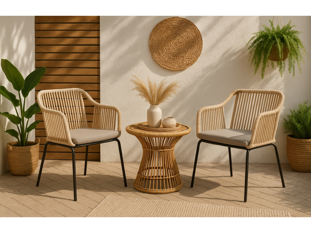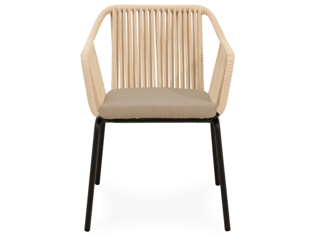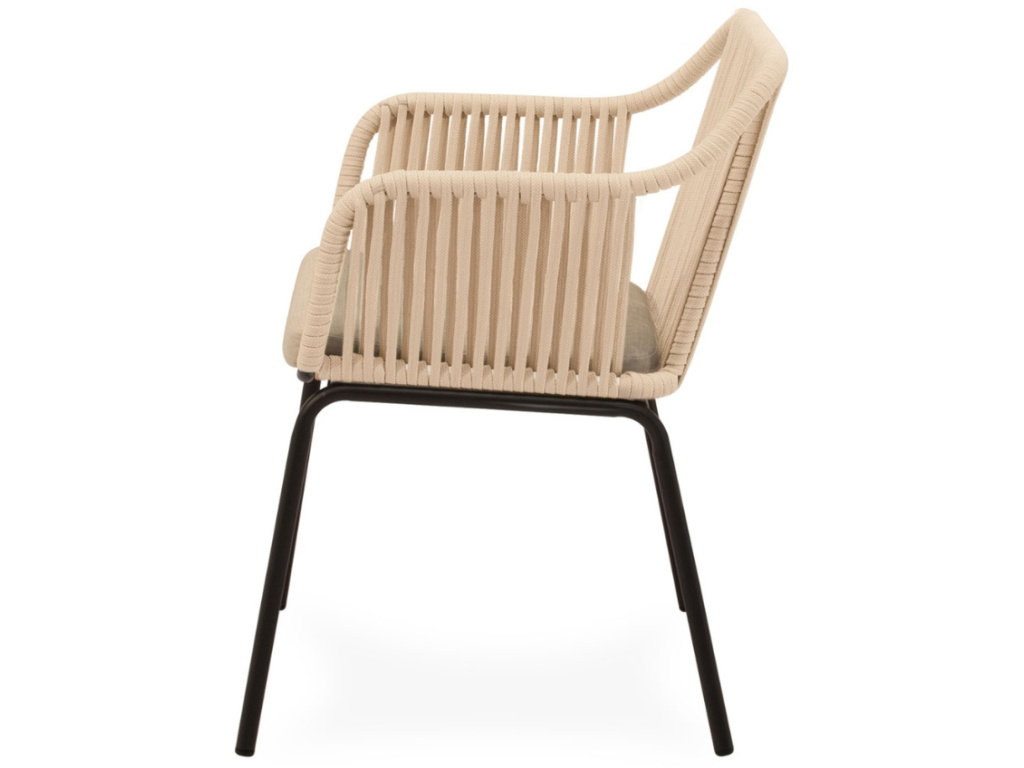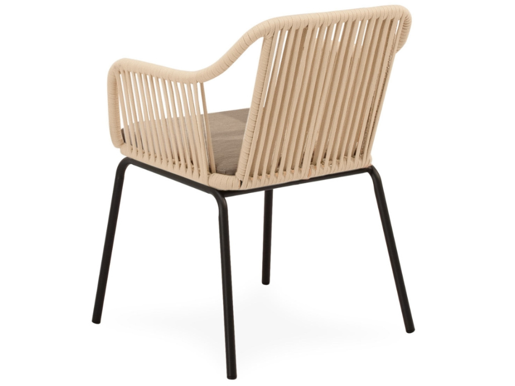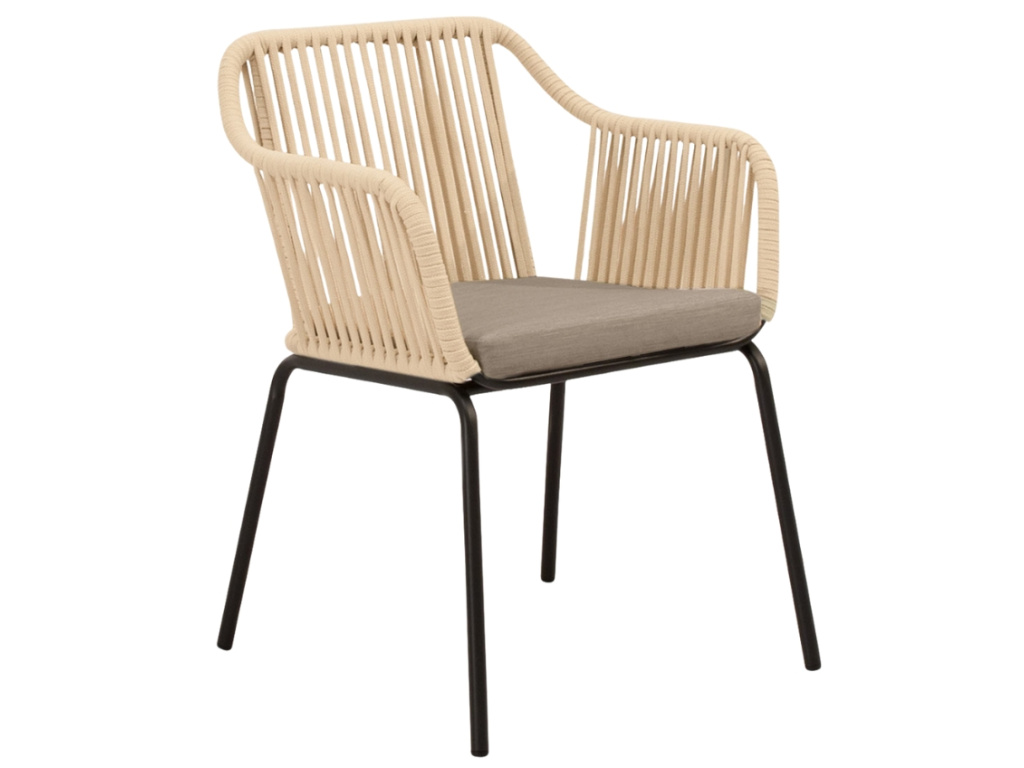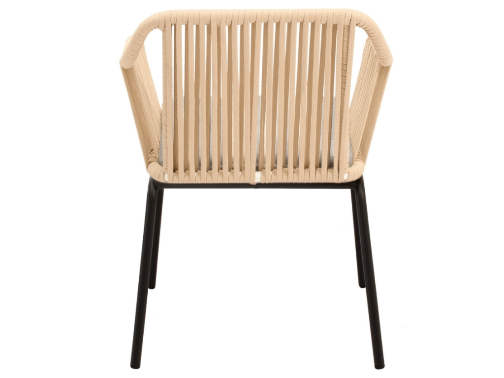 Zahradní židle Penny má zádovou opěrku i područky tvořené svislými liniemi z výpletu v krémové barvě. Tyto elegantní křivky nejenže zaujmou na pohled, ale zároveň poskytují pevnou, ergonomickou oporu. Černě lakovaná podnož je vyrobena z kvalitní pozinkované oceli. Měkký béžový sedák nabídne pohodlné sezení i při dlouhých letních večerech na terase. Celkový tvar této židle působí jako měkké objetí, které zve k odpočinku a zároveň podtrhuje lehkost a moderní charakter. K dostání je v pěti variantách.