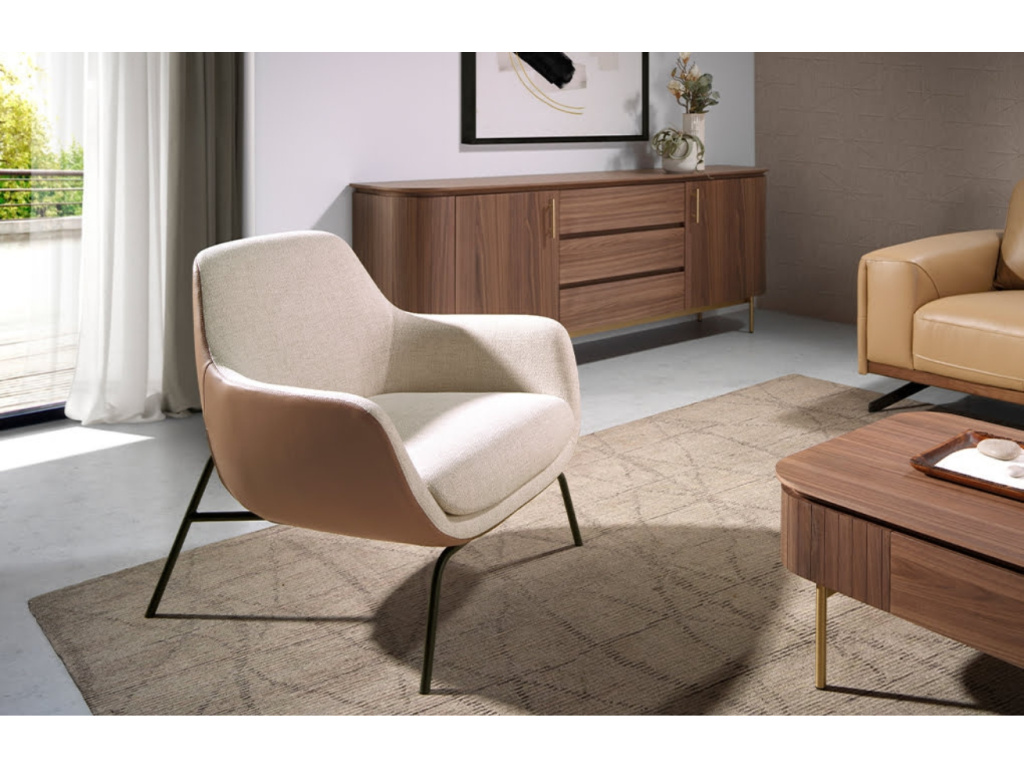 Příjemná kombinace béžové barvy čalounění a světle hnědé koženky dodávají křeslu No. 5099 od Angel Cerdá schopnost naplnit váš domov útulnou a hřejivou atmosférou. Subtilní, ale pevná podnož z nerezové oceli hravě kontrastuje s polstrovaným sedákem a prostorným opěradlem. Ty zaručují maximální pohodlí při vašich chvilkách odpočinku, ať už relaxujete v obývacím pokoji, ložnici nebo čtenářském koutku. Dopřejte si nevšední okamžiky s tímto jedinečným nábytkem.