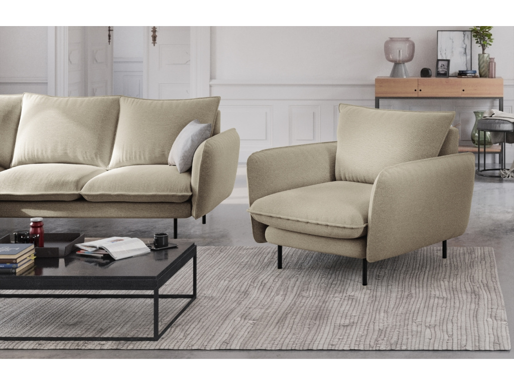 Křeslo Vienna od Cosmopolitan Design je poctou nadčasové eleganci, smyslu pro detail a dokonale vyváženým proporcím. Jeho jemně tvarované opěrky, měkký sedák a ladná silueta mu propůjčují vizuální lehkost, která zaujme na první pohled – a ještě více při posezení. Kontrastní černě lakovaná kovová podnož dodává celku vizuální vzdušnost a současně zajišťuje stabilitu. O vaše maximální pohodlí se postará čalounění ze strukturované látky s výraznou texturou – příjemnou na dotek, vizuálně zajímavou a zároveň mimořádně odolnou vůči každodennímu používání. Vienna vždy zapadne s lehkostí a zároveň dodá prostoru výraz. Skvěle se uplatní jako solitér pro chvíle klidu, stejně jako součást větší sedací sestavy. A právě tu můžete vytvořit s celou kolekcí Vienna, která kromě křesel nabízí také elegantní pohovky a pohodlnou lenošku – ideální pro ty, kteří chtějí styl i komfort dotáhnout do posledního detailu.