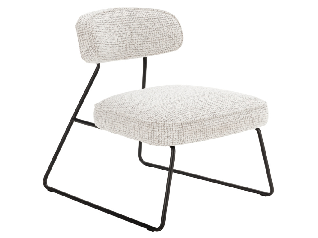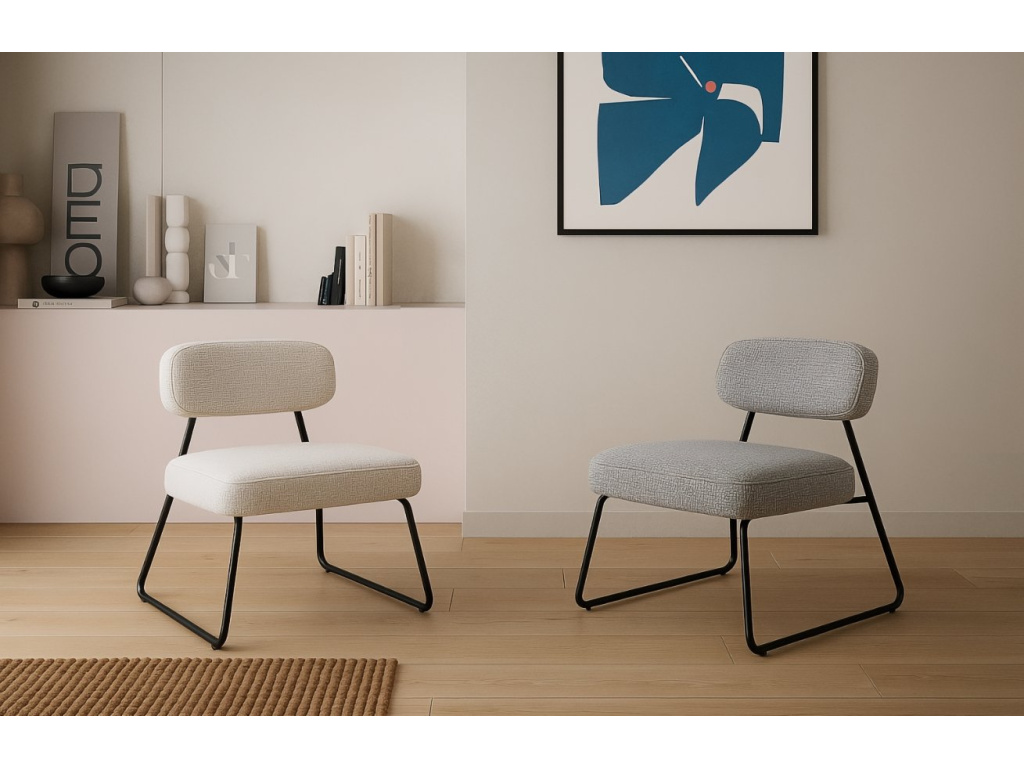 Křeslo Elon zaujme čistou geometrií a moderním pojetím komfortu. Robustní čalounění s výraznou strukturou látky s bílými a béžovými nuancemi kontrastuje s odlehčenou konstrukcí z černého kovu, která působí vzdušně a dynamicky. Díky svému designu skvěle zapadne do moderních obývacích pokojů, loftových interiérů nebo stylových kancelářských lounge zón. Model Elon je dostupný ve dvou barevných variantách.