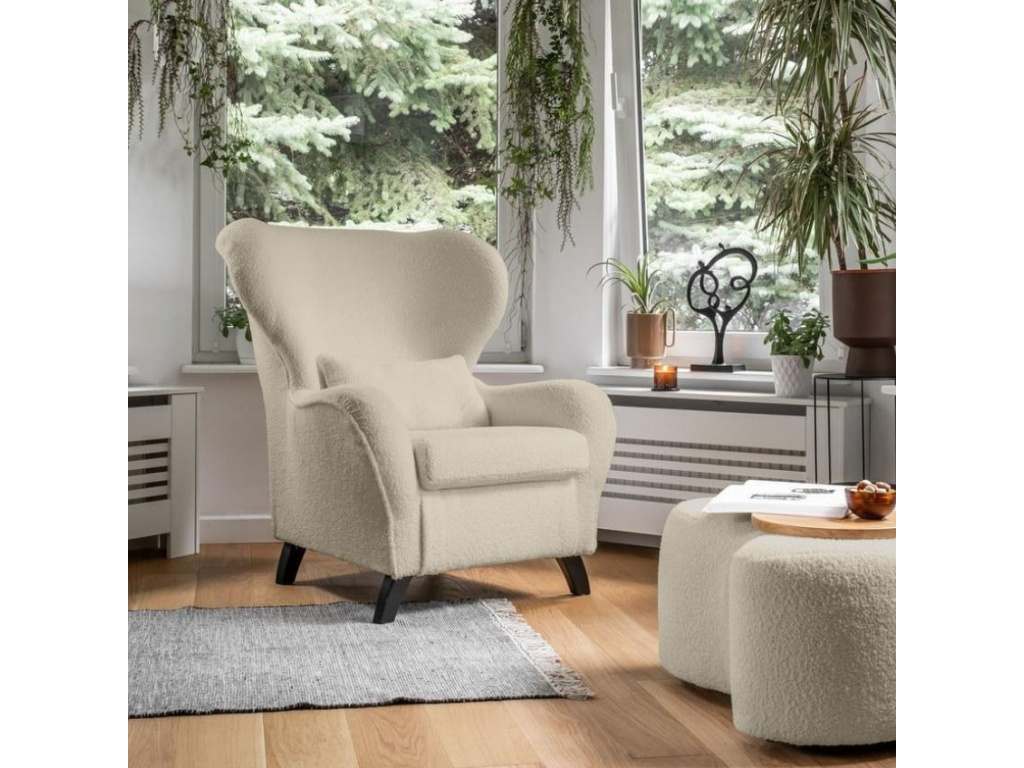 Křeslo Miuf od značky Miuform přesně odpovídá nejnovějším trendům bydlení. Nejen, že má klasický tvar ušáka, ale také je plně pokryté měkkou a trendy bouclé tkaninou v béžovém odstínu. Něco jiného než samet, ale má minimálně stejně vysoký faktor pohodlí. Celkový design doladí černě lakovaná buková podnož. Křeslo Miuf, díky své barvě a jedinečnému tvaru, skvěle zapadne do každého interiéru. Navíc jej doporučujeme kombinovat i s taburety řady Miuf, které dodají to pravé pohodlí při posezení.