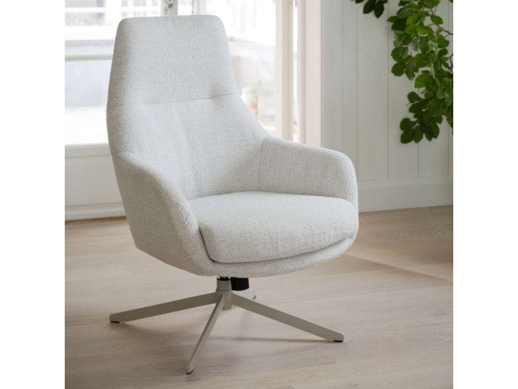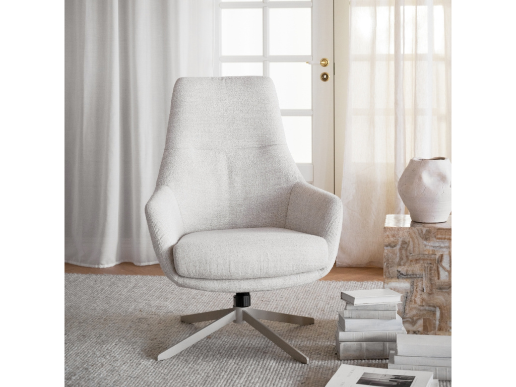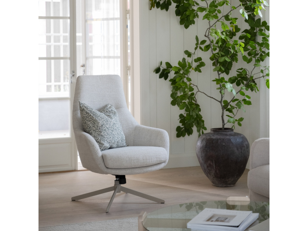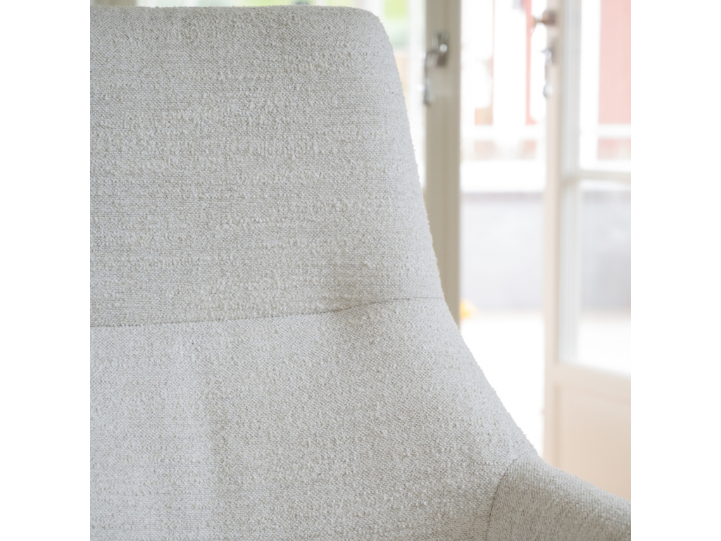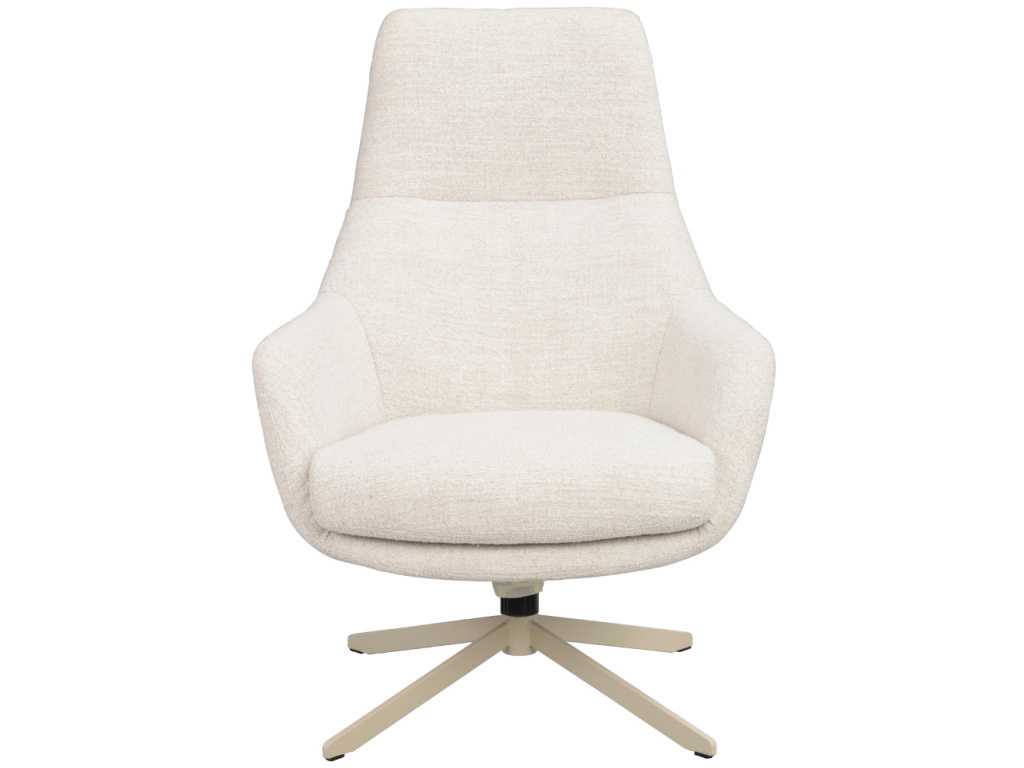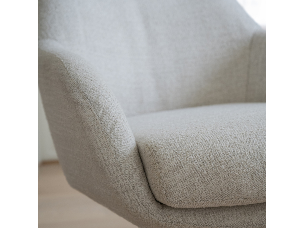 Křeslo Conroe zaujme moderním designem, který spojuje estetiku s funkčností. Silný polstrovaný sedák s výplní z polyetheru a pružinami zaručuje výjimečné pohodlí i při delším sezení. Pudrově béžová kovová podnož s jemnou texturou dodává celkovému vzhledu křesla lehkost a vizuální harmonii. Díky otočné a houpací funkci se Conroe stává ideálním místem k odpočinku, které se vám maximálně přizpůsobí.