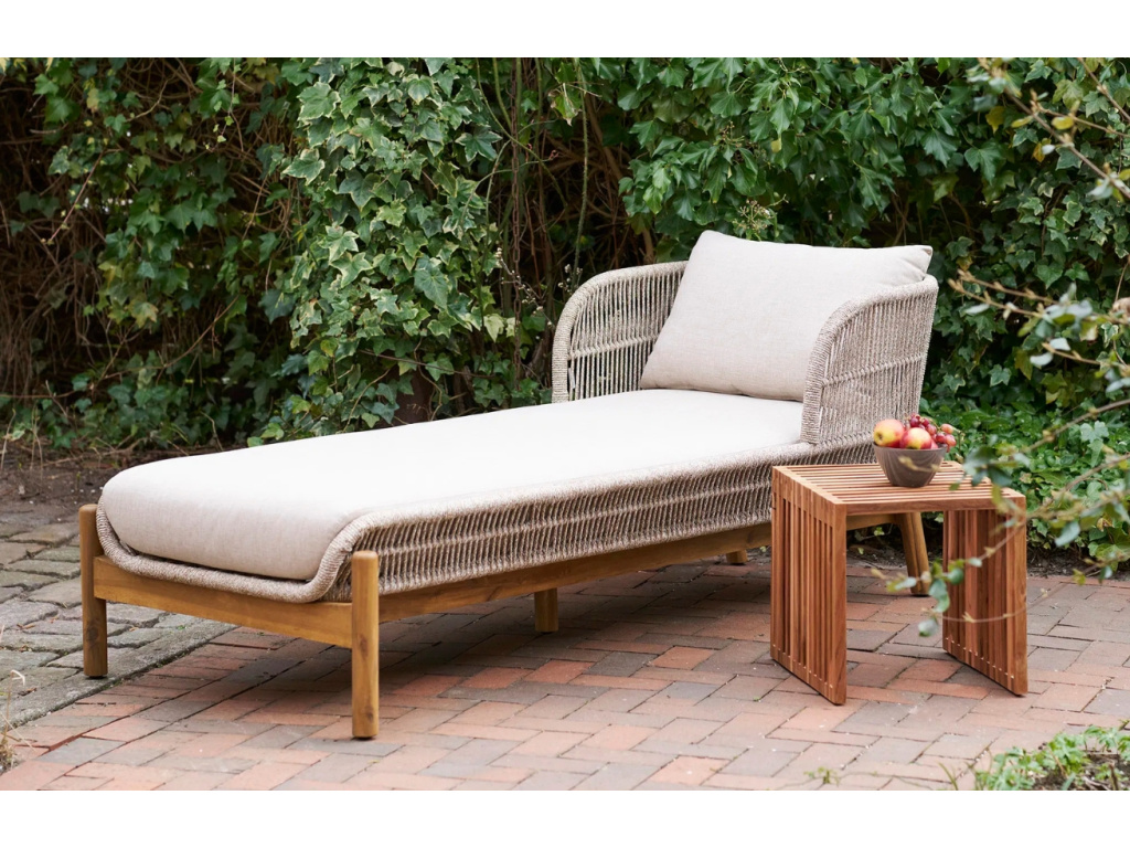 Lehátko Terracina bude vaší vstupenkou k opravdovému letnímu relaxu – ať už na terase, balkonu nebo u bazénu. Jeho vzdušná konstrukce s výpletem z lana a akátové podnože je doplněna měkkým polstrováním s odnímatelnými polštáři, které poskytnou pohodlí na celé odpoledne. Kombinace jemné béžové barvy a přírodního rámu působí harmonicky a elegantně. Lehátko snadno sladíte s textilními doplňky nebo dekoracemi ve středomořském či boho stylu.