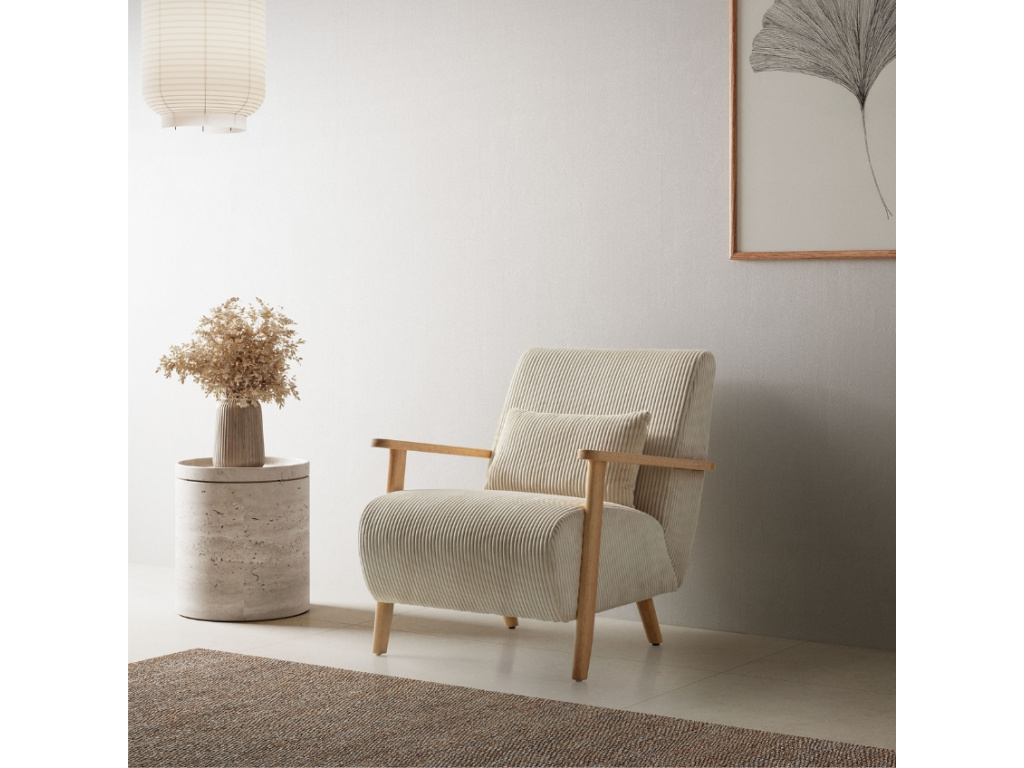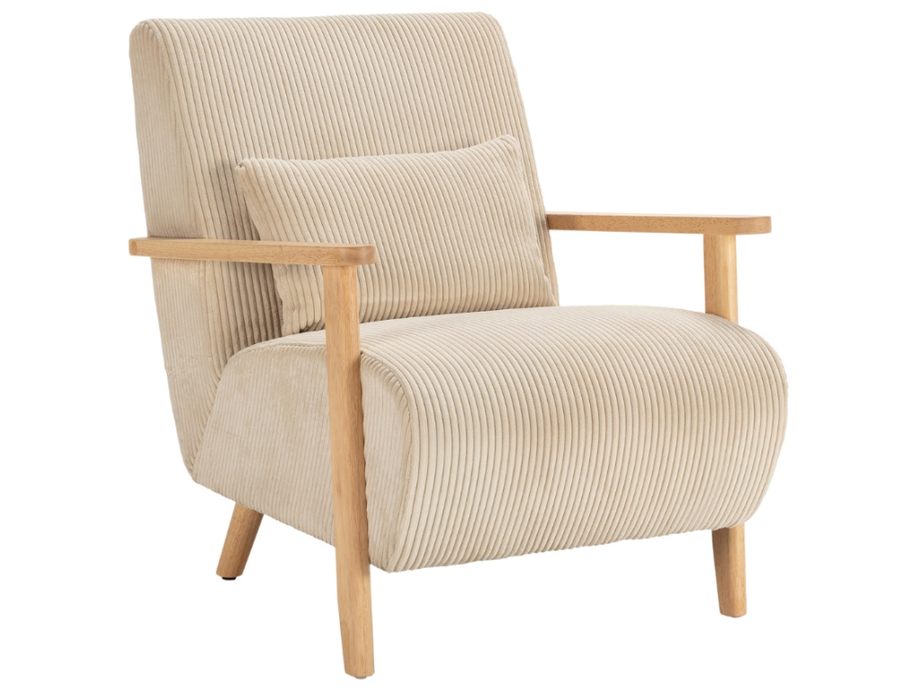 Křeslo Bonnie zaujme klasickým vzhledem s lehkým retro nádechem a čalouněním z béžového manšestru a masivní dubovou podnoží. Díky přírodnímu tónu a elegantnímu provedení se skvěle hodí do skandinávských i moderních obývacích pokojů či čtecích koutků. Součástí je i ladící polštářek pro ještě větší pohodlí. K dispozici je ve dvou variantách.