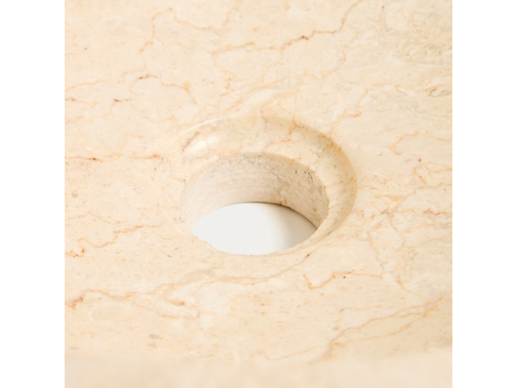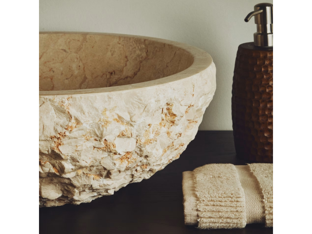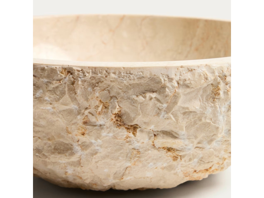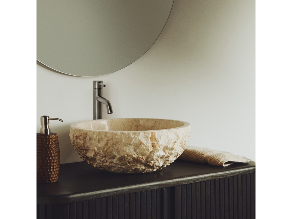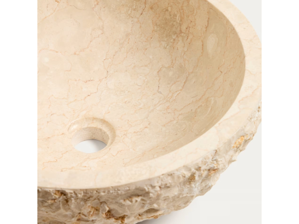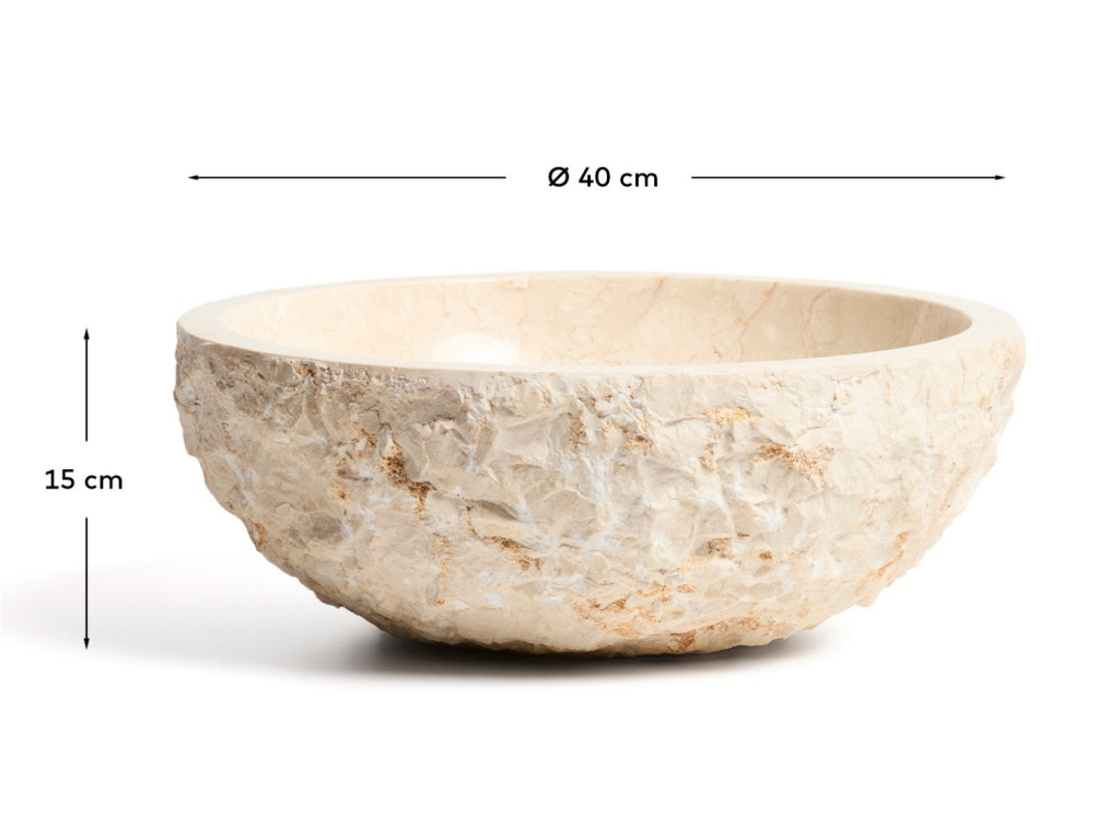 Mramorové umyvadlo na desku Orvane je unikátní ručně vyráběný kus z mramoru těženého na ostrově Jáva. Každý kus je pečlivě tvarován tradičními nástroji, díky čemuž se liší jemnou zrnitostí a odstíny – typickou krásou přírodního materiálu. Leštěný vnitřní povrch zvýrazňuje přirozený lesk kamene, zatímco opracovaná vnější strana dodává elegantní texturu. Masivní složení mramoru zajišťuje vysokou odolnost a trvanlivost i ve vlhkém prostředí koupelny a při každodenním používání, čímž kombinuje luxusní vzhled s dlouhodobou praktičností.