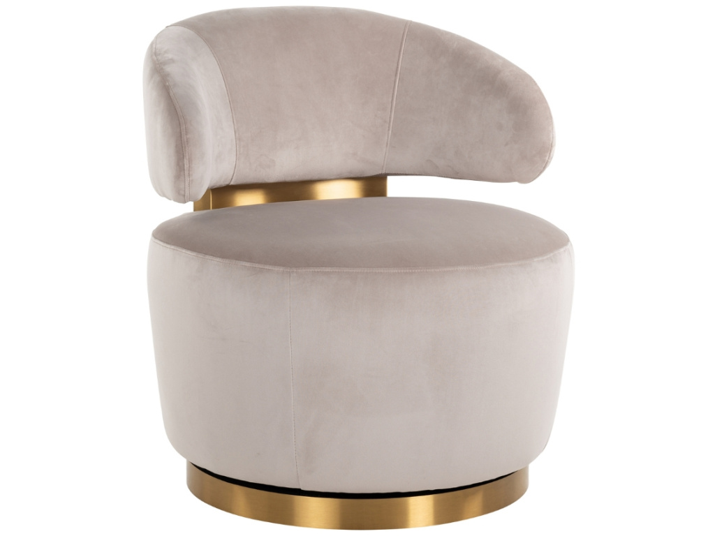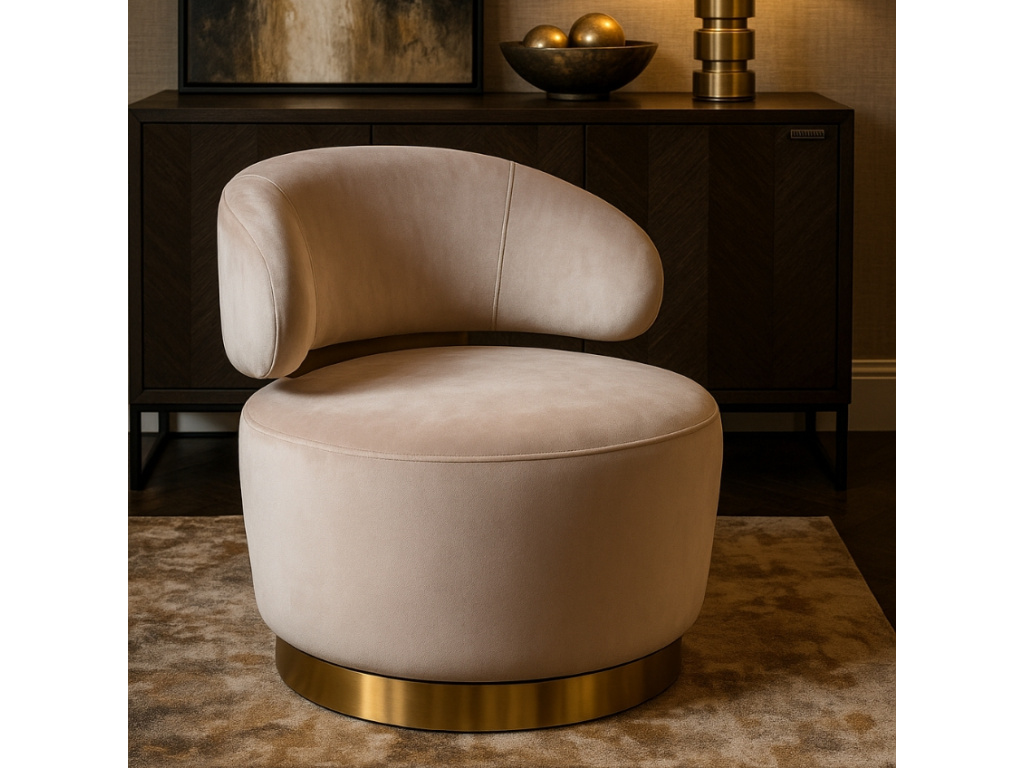 Luxusní design otočného křesla Maxime od značky Richmond Interiors se adaptuje v každém moderním interiéru a komerčních prostorech jako jsou hotelové lobby či glamour salónky. Čalounění z příjemné sametové látky béžové barvy doprovází zlatá kovová otočná základna. Nádherné křeslo nápaditého tvaru je opravdovou lahůdkou pro milovníky originálního a jedinečného nábytku.