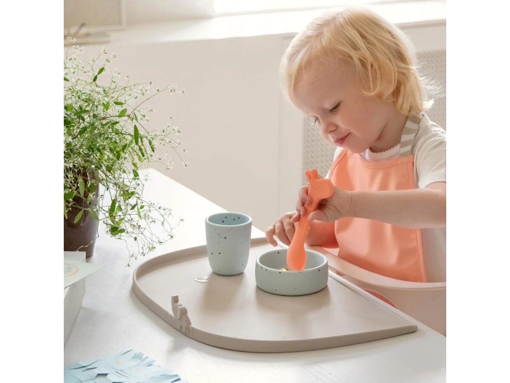 Roztomilý slon Elphee bude při jídle doprovázet všechny malé jedlíky při jakémkoliv chodu. Zdobí totiž okraj prostírání, a bystré dětské očko může zahlédnout i jeho stopy. Béžové prostírání od Done by Deer je vyrobené z protiskluzového silikonu, proto nemusíte mít obavy, že z něj nádobí sklouzne. Vyvýšený okraj zase zajistí, že se nádobí jen tak nepřevrhne. Prostírání ochrání desku stolu před znečištěním, jeho velkou výhodou je možnost nechat ho umýt v myčce na nádobí.