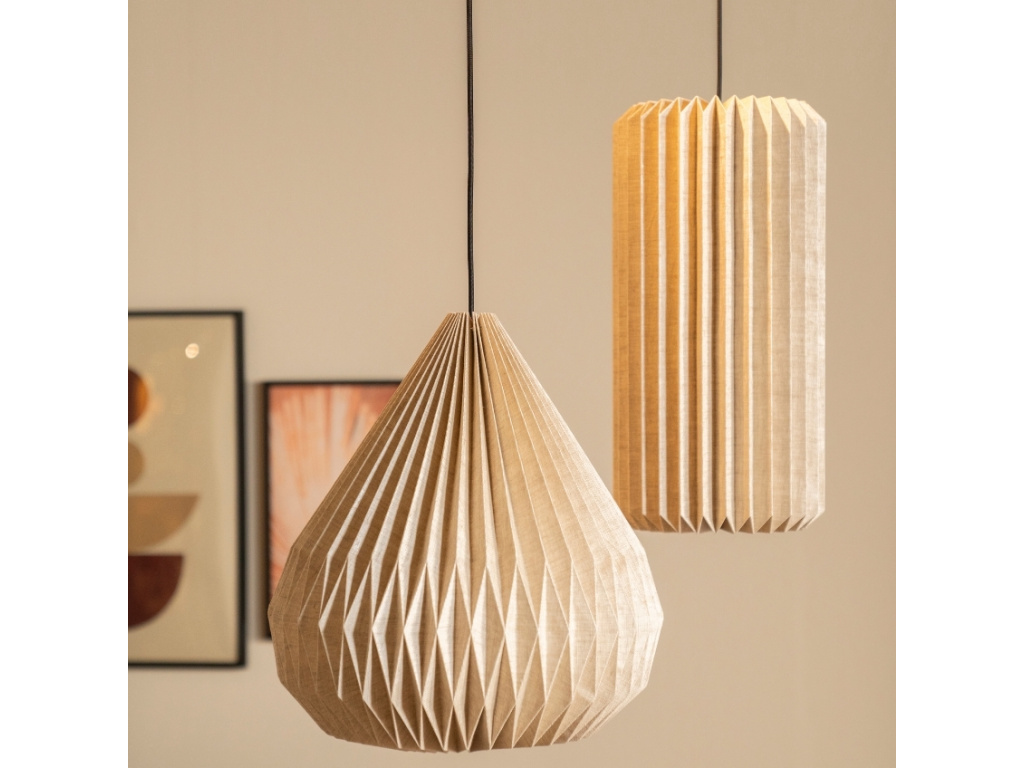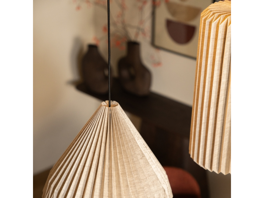 Vzdušné závěsné světlo Zuki z přírodního lnu přináší do vašeho domova jedinečnou harmonii přírody a designu. Jeho rafinovaný skládaný tvar, inspirovaný japonským origami, propůjčuje místnosti jemný akcent, který potěší oko i mysl. Díky možnosti kombinovat různé tvary z kolekce Zuki snadno vytvoříte působivou a zároveň uklidňující atmosféru, která skvěle ladí se skandinávským stylem nebo minimalistickým interiérem. Lněné plátno jemně filtruje světlo a vytváří hřejivé osvětlení, ideální pro útulné večery. Zuki je více než jen světlo – je to designový prvek, který promění váš prostor v oázu umění.