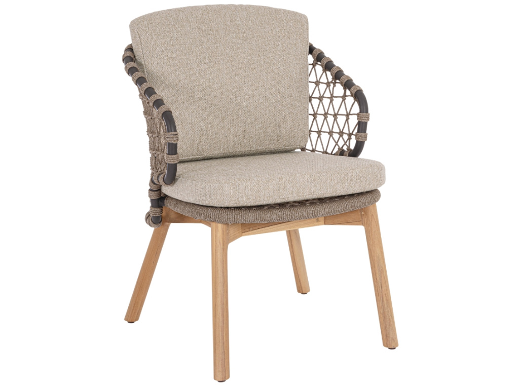 Židle Eularia propojuje přírodní estetiku s moderní funkčností. Její pevná hliníková konstrukce je doplněna o podnož z teakového dřeva, které dodává židli hřejivý přírodní akcent. Elegantní tkaný výplet z polypropylenového lana přidává vzdušnost a vizuální lehkost, zatímco polstrovaný sedák s vodoodpudivým potahem přispívá k maximálnímu pohodlí. Skvěle se hodí k venkovnímu jídelnímu stolu, kde vytvoří dokonalou atmosféru pro letní stolování.