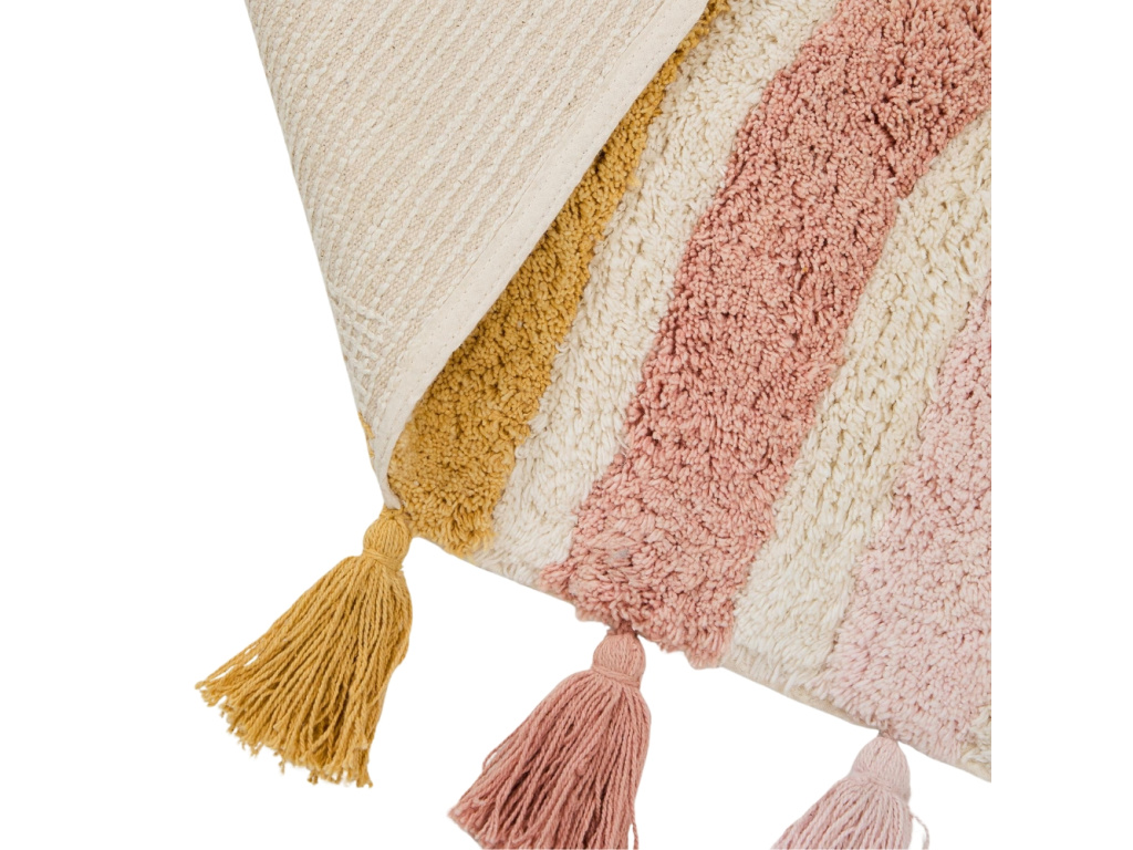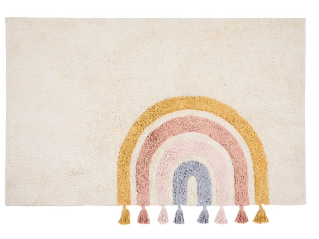 Vneste do dětského pokoje hravost a měkkost s kobercem Tadea, který svým tvarem duhy a jemnými pastelovými tóny podněcuje dětskou fantazii. Je vyroben ze stoprocentní bavlny, takže poskytuje hřejivý a bezpečný prostor pro nekonečné hodiny hraní na podlaze. Díky svému čistému designu skvěle doplní interiéry v severském stylu nebo moderní pokoje laděné do přírodních materiálů.