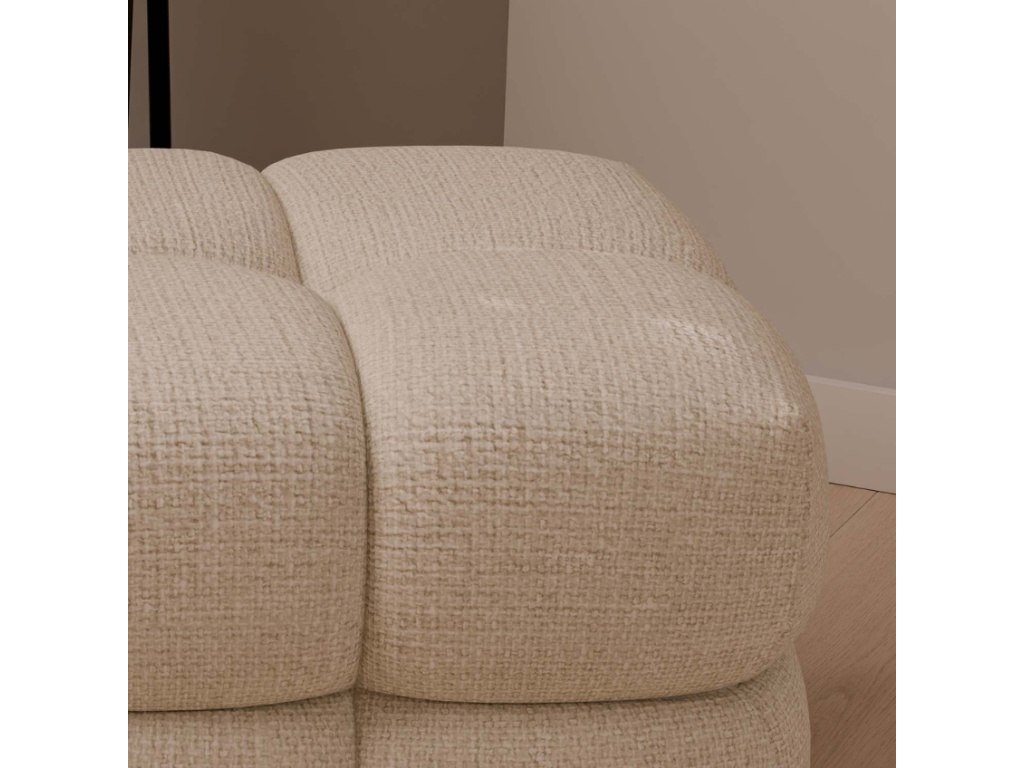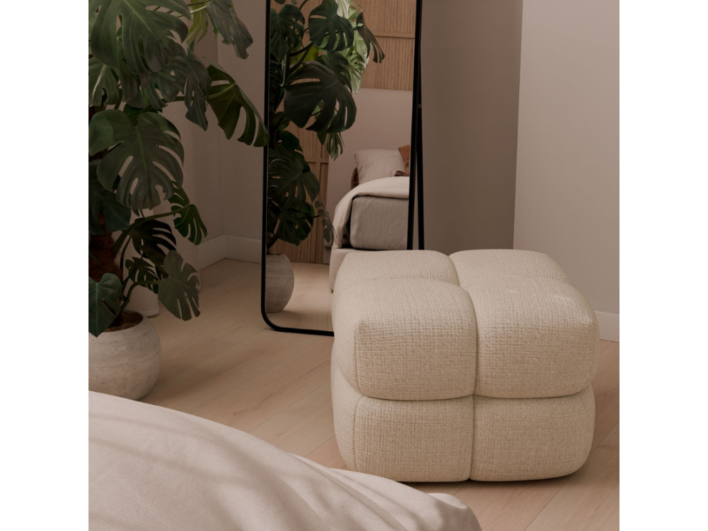 Tento čtvercový taburet Troy v elegantní béžové barvě vnese do interiéru měkkost, útulnost a moderní minimalismus. Robustní polstrování rozdělené do čtyř segmentů vytváří vizuálně zajímavý detail a zaručuje pohodlné sezení či opření nohou. Díky neutrálnímu odstínu se snadno kombinuje s různými styly nábytku, od minimalistického po boho. Skvěle poslouží jako doplněk obývacího pokoje, ložnice i čtecího koutku.