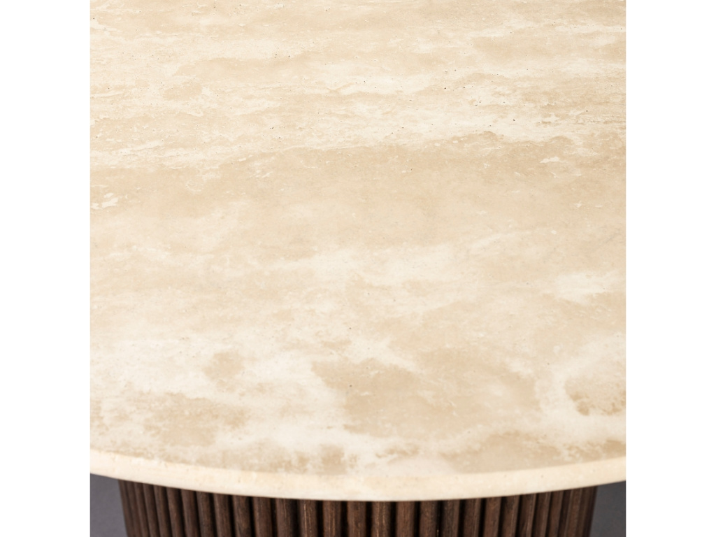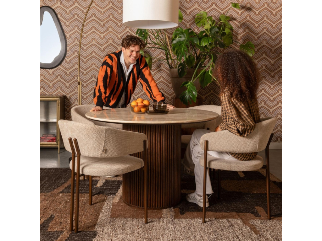 Jídelní stůl ARDA značky DUTCHBONE si získá vaši pozornost především pro jedinečnou kamennou deskou z travertinu. Ta dodá interiéru nádech luxusu a elegance. Travertin je druh vápence s živoucí texturou, která dodává stolku přirozenou krásu a časem i jedinečnou patinu. Kamenná deska spolu s robustní podnoží z dubové dýhy v ořechovém provedení tvoří perfektní celek. Vytvořte si doma jídelní kout pro nezapomenutelné hostiny. ARDA zazáří v moderním i vintage interiéru a nejlépe ve společnosti dalšího nábytku z řady ARDA – zkompletujete celý set?