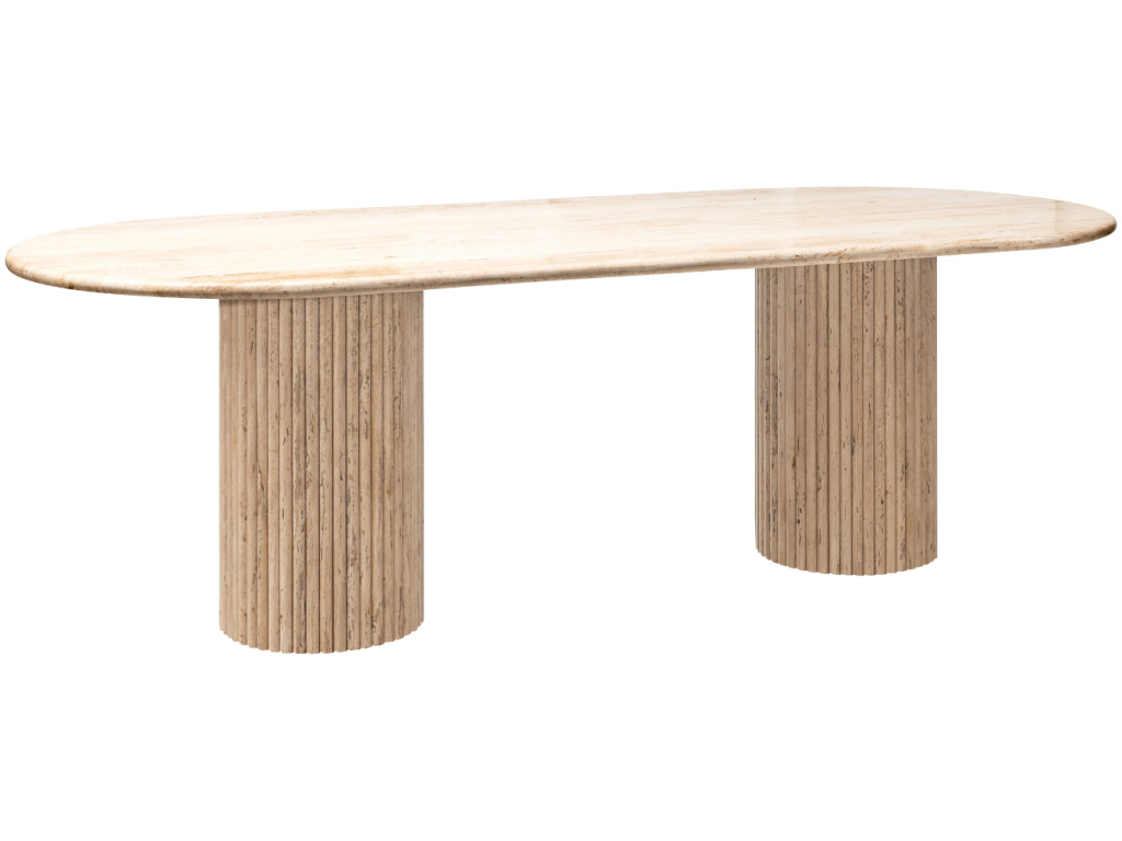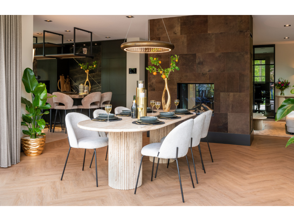 Vytvořte si doma jídelní kout pro nezapomenutelné hostiny se stolem La Cantera od značky Richmond. Tento jedinečný kousek se může pochlubit oválnou travertinovou deskou pískově béžové barvy, která krásně kontrastuje s jeho robustní dvoudílnou podnoží. Směs zemité estetiky a moderního designu stolu vytváří poutavý celek, které zaujme na první pohled. Prostorná deska o šířce 240 cm umožňuje posadit ke stolu až 8 osob, La Cantera je tak ideální pro velké slavnostní obědy a večeře s rodinou či přáteli. Povznese atmosféru celé místnosti a udělá z každého jídla zvláštní příležitost.
