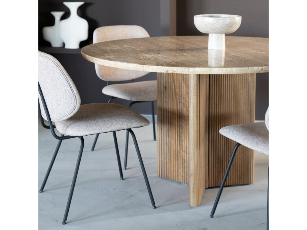 Jídelní stůl Sara od značky Eleonora zaujme svou jedinečnou kamennou deskou z travertinu, která dodá vašemu interiéru nádech luxusu a elegance. Travertin je přírodní druh vápence, který se pyšní živoucí texturou a v průběhu času získává jedinečnou patinu. Kamenná deska v kombinaci s podnoží z mangového dřeva vytváří působivý kontrast. Stolek dokonale zapadne jak do rustikálních, tak i do klasických interiérů. Sara je nejen funkční kus nábytku, ale i designový skvost, který do vašeho prostoru přinese nezaměnitelný šarm. Kromě jídelního stolu série Sara zahrnuje také konferenční a odkládací stolek.