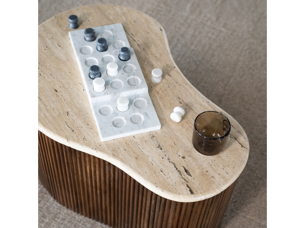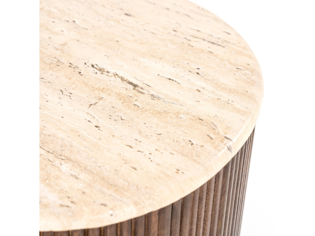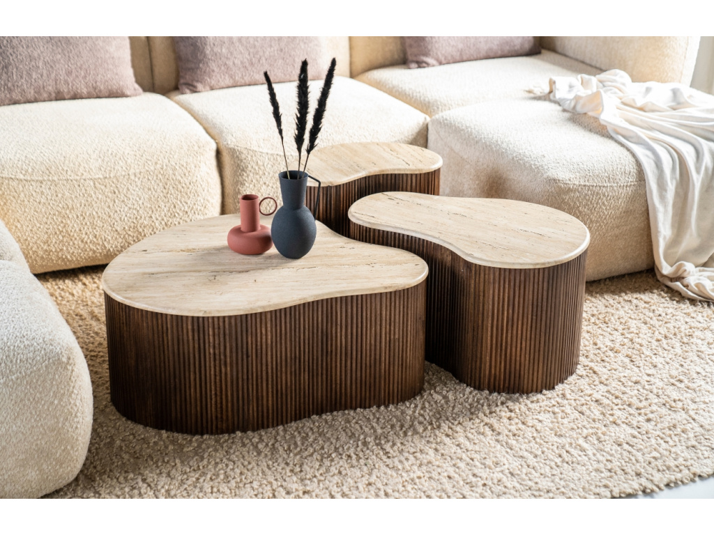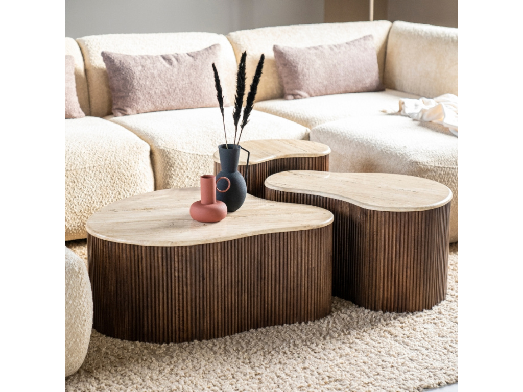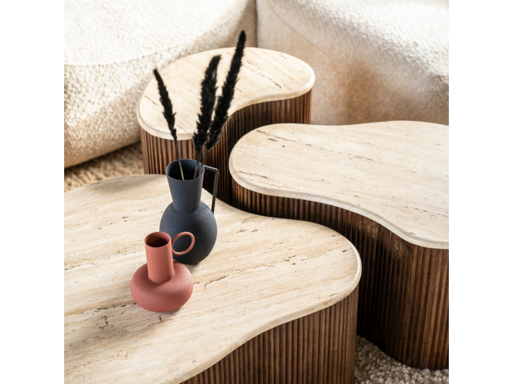 Konferenční stolek Mari od značky Eleonora zaujme svou jedinečnou kamennou deskou z travertinu, ale i svými organickými tvary. Travertin je přírodní druh vápence, který vyniká živoucí texturou a v průběhu času získává jedinečnou patinu. Kamenná deska v kombinaci s podnoží z mangového dřeva vytváří harmonický kontrast. Stolek dokonale zapadne jak do rustikálních, tak i do klasických prostorů. Kolekce Mari zahrnuje nejen dva konferenční stolky, ale i praktický odkládací stolek.