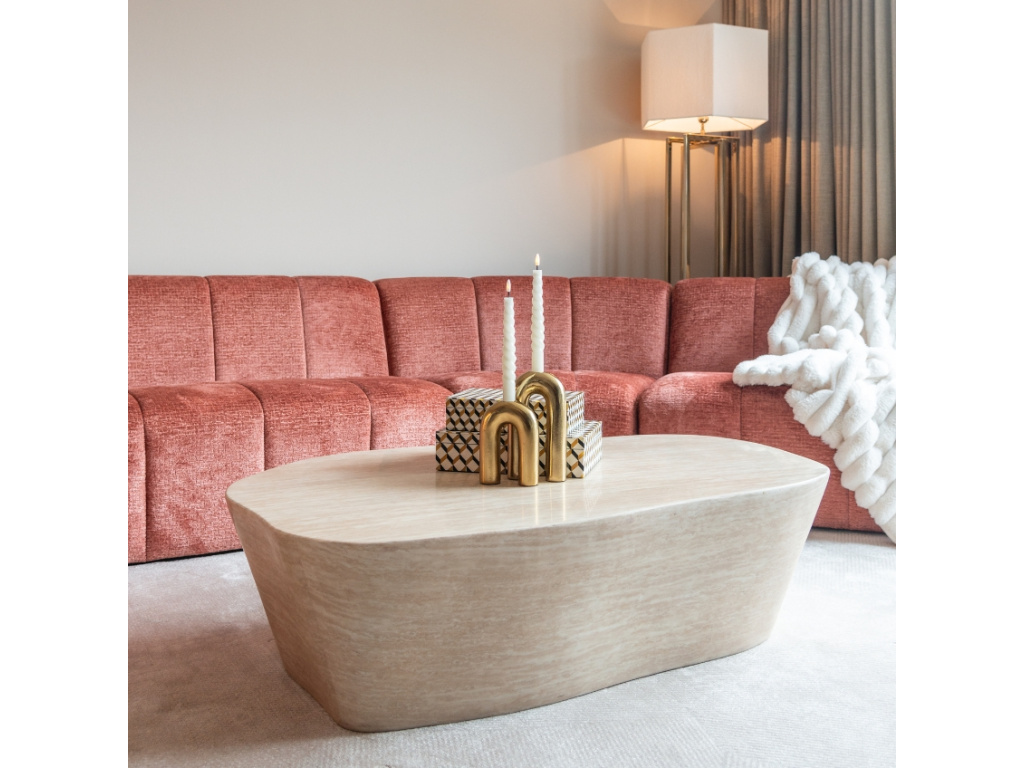 Konferenční stolek Fictus od značky Richmond si získá vaši pozornost svou masivní konstrukcí z travertinového kamene, který přinese interiéru nádech luxusu a elegance. Travertin je druh vápence vyznačující se odolností a porézní texturou, která stolku dodává přirozenou krásu a časem i jedinečnou patinu. Zkombinujte stolek s dalšími produkty z rady Fictus z tohoto výjimečného materiálu a vylaďte tak váš interiér k dokonalosti.