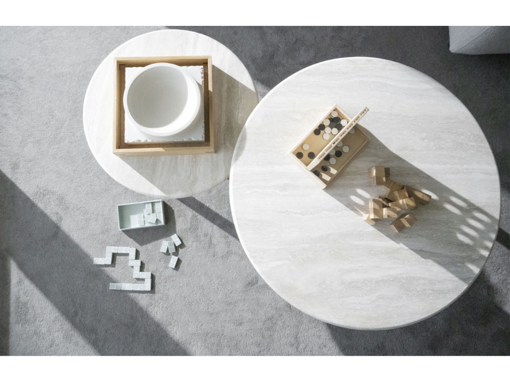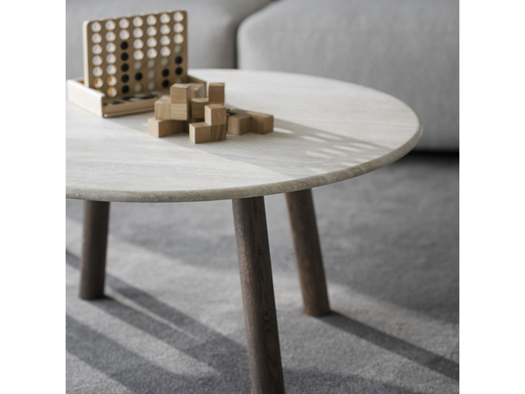 Konferenční stolek s kulatou deskou ROWICO TARANSAY si získá vaši pozornost především pro jedinečnou kamennou deskou z italského Travertinu. Ta dodá interiéru nádech luxusu a elegance. Travertin je druh vápence s živoucí texturou, která dodává stolu přirozenou krásu a časem i jedinečnou patinu. Béžová kamenná deska a hnědě lakovaná dubová podnož s certifikací FSC tvoří perfektní celek, který skvěle zapadne nejen do rustikálních prostorů. Dřevo je díky certifikaci FSC ekologicky šetrné a výroba stolu tak nezatěžuje životní prostředí. ROWICO nabízí různé velikosti stolů TARANSAY.