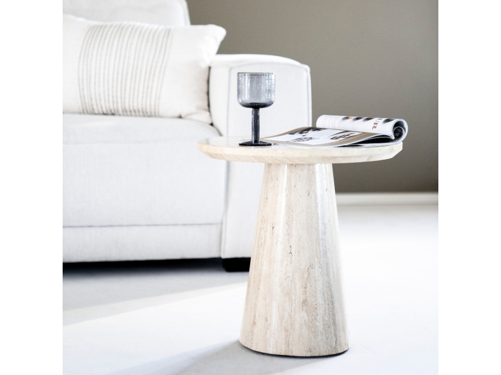 Odkládací stolek Aime od značky Eleonora si získá vaši pozornost především díky jedinečnému zpracování z travertinu. To dodá interiéru nádech luxusu a elegance. Travertin je druh vápence s živoucí texturou, která dodává stolku přirozenou krásu a časem i jedinečnou patinu. Stolek Aime je ideální pro umístění vedle pohovky, kde poslouží k odložení šálku kávy nebo vystavení vašich oblíbených dekorací. Doplňte ho o konferenční stolek Aime a vytvořte harmonický a elegantní interiér, který osloví na první pohled.