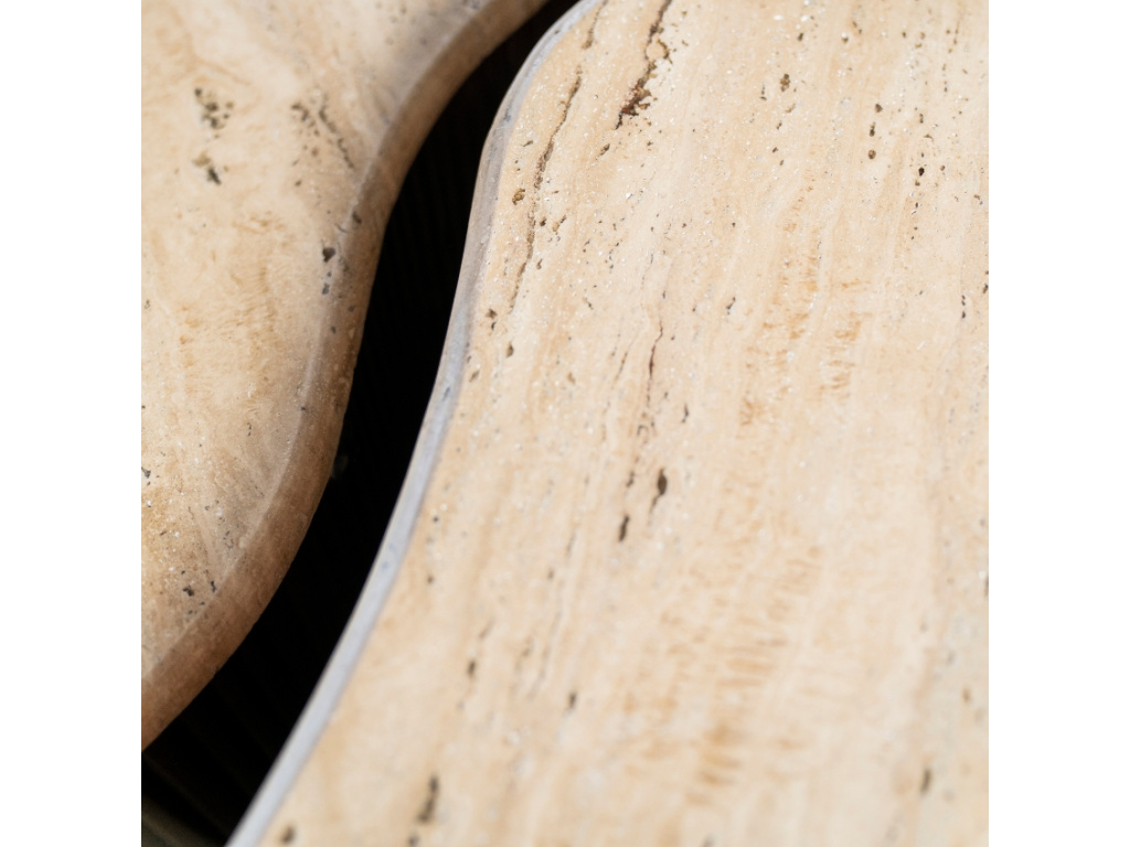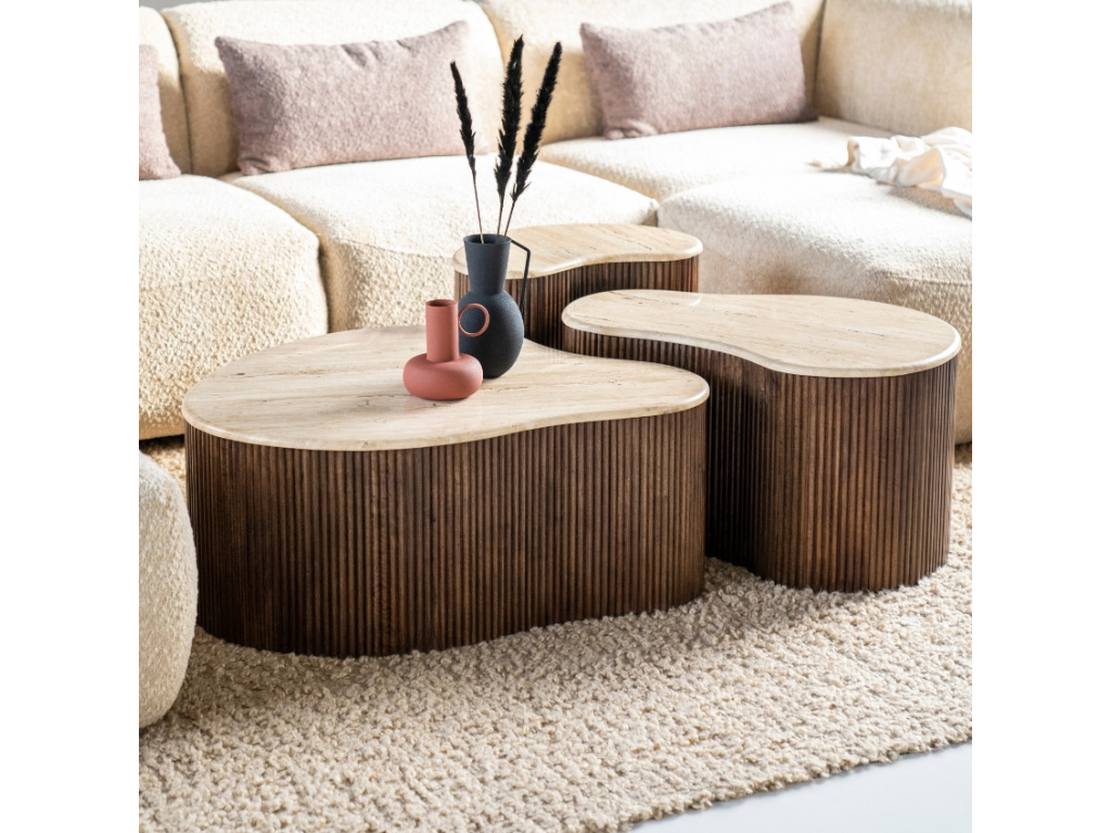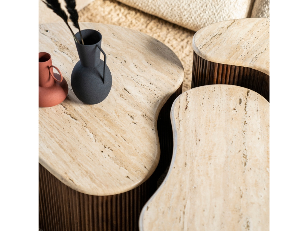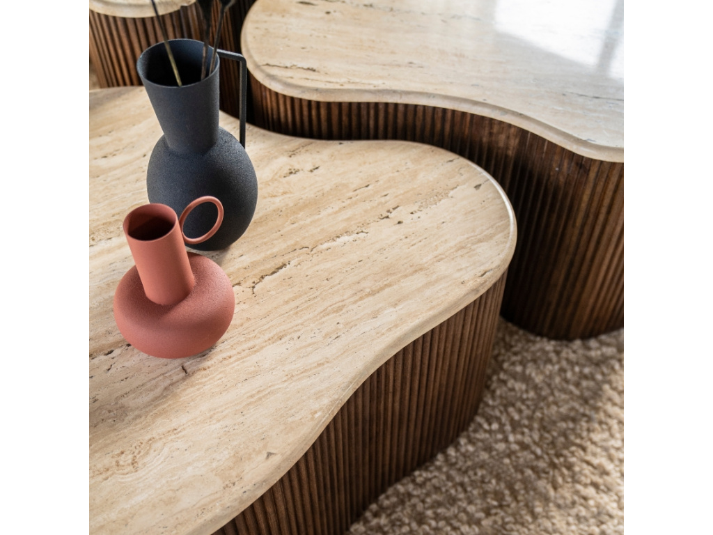 Odkládací stolek Mari od značky Eleonora zaujme svou jedinečnou kamennou deskou z travertinu, ale i svými organickými tvary. Travertin je přírodní druh vápence, který se pyšní živoucí texturou a v průběhu času získává jedinečnou patinu. Kamenná deska v kombinaci s podnoží z mangového dřeva vytváří harmonický kontrast. Stolek dokonale zapadne jak do rustikálních, tak i do klasických prostorů. Kromě odkládacího stolku série Mari zahrnuje také konferenční stolky, které dokonale doplní váš prostor.