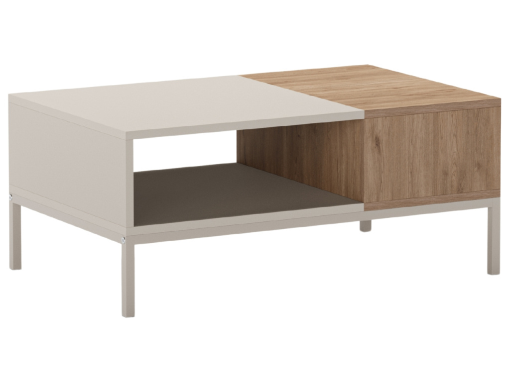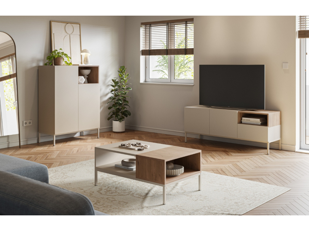 Konferenční stolek Cailin v krémové barvě s přírodním dekorem dřeva zaujme minimalistickým vzhledem a praktickým zpracováním. Korpus je vyroben z kvalitních MDF desek a subtilní podnož je z lakovaného kovu. Stolek má chytře řešený úložný prostor v podobě dvou polic. Hodí se do skandinávských, minimalistických i přírodně laděných interiérů. Tato kolekce zahrnuje kromě konferenčního stolku také tři varianty komod a dva velikostní typy TV stolků. K dostání je rovněž ve variantě s dřevěným dekorem.