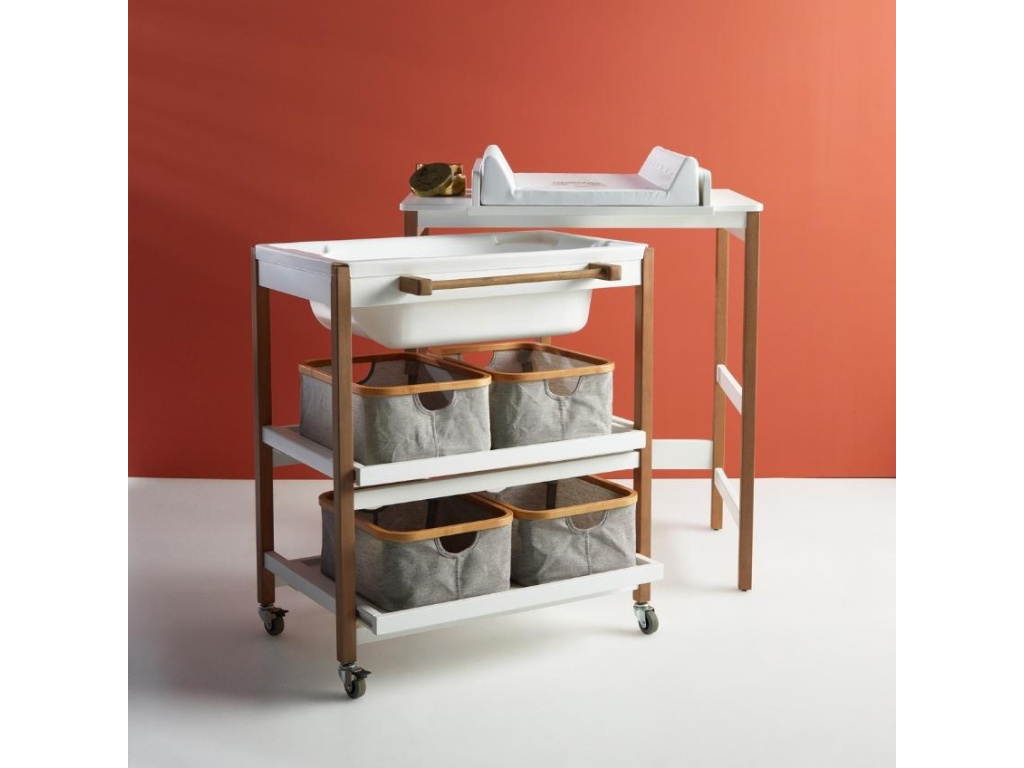 Praktický přebalovací pult Quax Smart je užitečným pomocníkem, který mamince zpříjemní koupání i přebalování miminka. Pult se skládá ze dvou částí, menší část s vaničkou je vybavena výpustí. Vanička s kolečky se dá snadno zasunout pod přebalovací pult. Přebalovací pult je vhodný pro všechny typy podložek Quax s rozměrem 50 x 70 cm a 67 x 44 cm. Quax Smart je vybaven velmi pevnou podnož z bukového dřeva, která má nosnost až 11 kg. Výsuvné police ve spodní části jsou praktickým úložným prostorem, který můžete vybavit úložnými boxy Quax Stella pro větší pořádek.