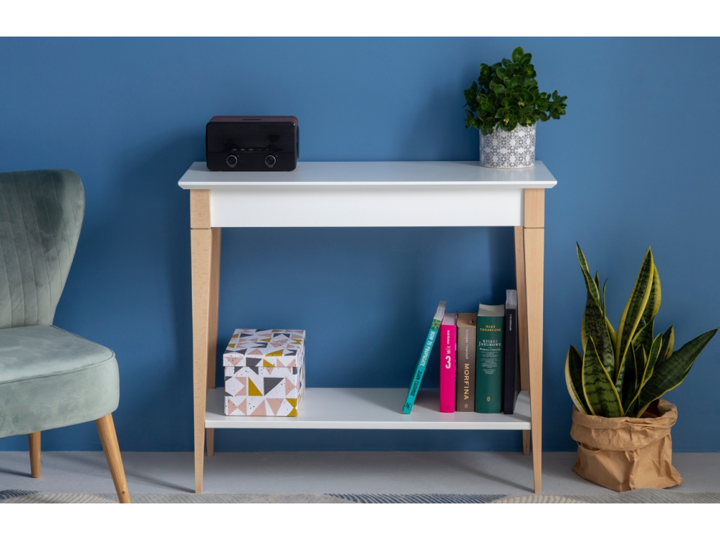 Toaletní stolek RAGABA MIMO je moderním stolkem, který je inspirovaný klasickým skandinávským designem. Stolek snoubí minimalismus v podobě čisté desky z MDF spolu s elegancí ve formě podnože, vyrobené z bukového masivu. Praktickým prvkem stolku je spodní police, kterou využijete na vaše oblíbené dekorace, knihy či květiny. Díky své úsporné velikosti se toaletní stolek hodí i do menších interiérů a skvěle vynikne například v ložnici, obývacím pokoji či předsíni.