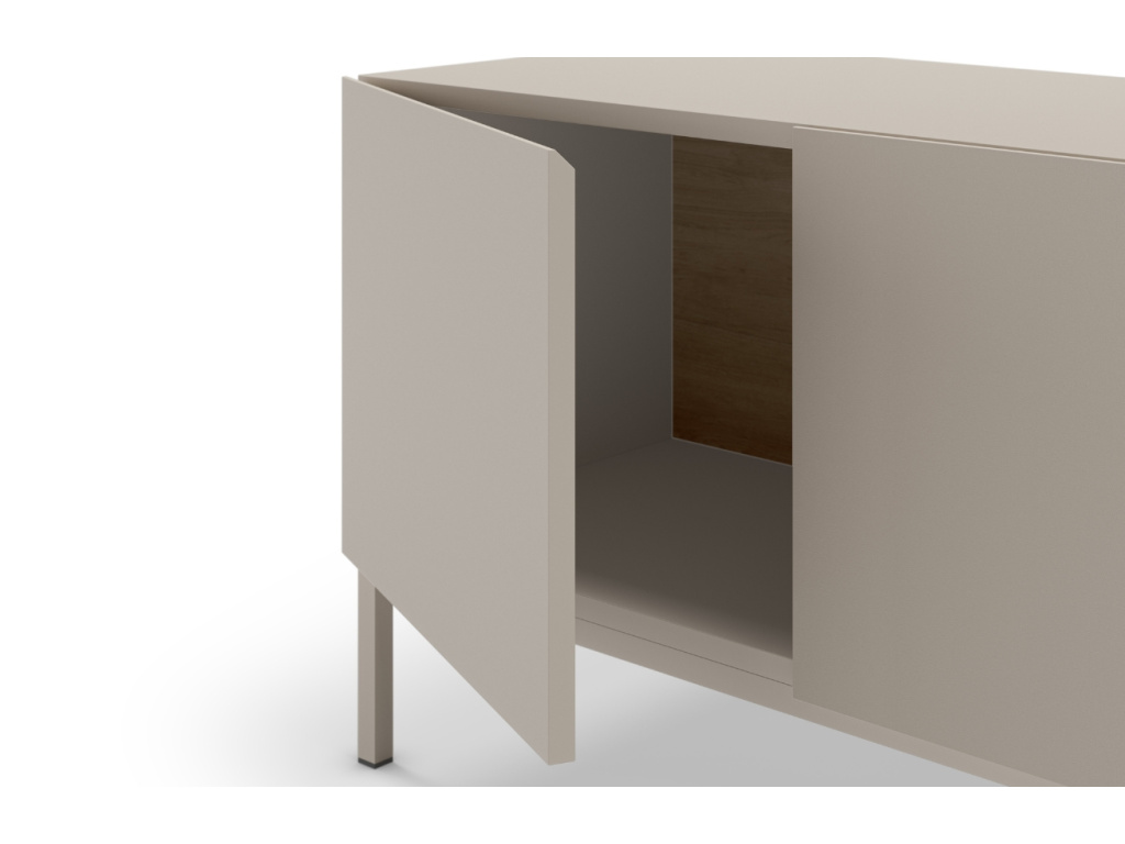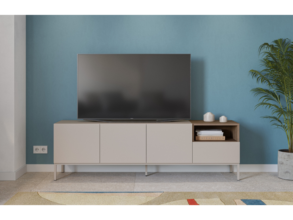 Televizní stolek Cailin zaujme elegantní kombinací krémového laku a přírodního dekoru dřeva, která působí jemně a útulně zároveň. Korpus je vyroben z kvalitních MDF desek a subtilní podnož je z lakovaného kovu. Esteticky i prakticky potěší zkosená horní hrana dvířek a zásuvky, která nahrazuje klasické úchytky a podtrhuje čistý design. Tento kousek se skvěle hodí do moderních, skandinávských i přírodně laděných interiérů. Kolekce Cailin nabízí také konferenční stolek, tři velikosti komod a dvě varianty TV stolků. K dostání je rovněž ve variantě s dřevěným dekorem.