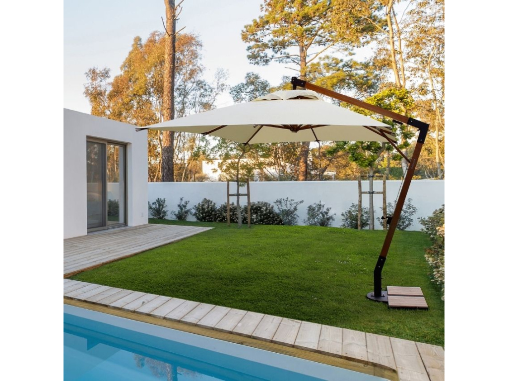 Slunečník Bizzotto Canupa oceníte na každé zahradě, u bazénu a na terase. V horkých letních měsících se snadno schováte před rozpáleným sluncem pod prostorný a odolný látkový potah v příjemné béžové barvě, která krásně ladí s konstrukcí z teakového dřeva, která je navíc místy zpevněná kovem. Na slunečníku oceníte i možnost jeho otočení až o 180°, díky čemuž si vytvořený stín můžete posunout na místo, kde jej zrovna potřebujete.