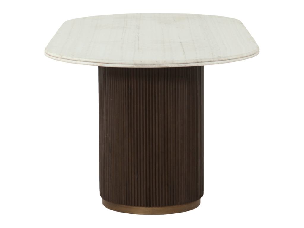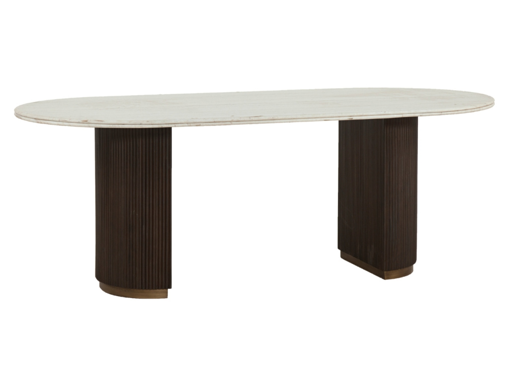 Jídelní stůl Mayfield kombinuje luxus mramoru s moderní elegancí. Oválná mramorová deska je harmonicky doplněna půlkruhovou podnoží s lamelovou texturou doplněnou o stylový mosazný detail, což vytváří unikátní vzhled. Tento stůl se stane centrálním bodem každé jídelny. Ideální volba pro ty, kteří si potrpí na kombinaci kvalitních materiálů a prostorově výrazného designu.