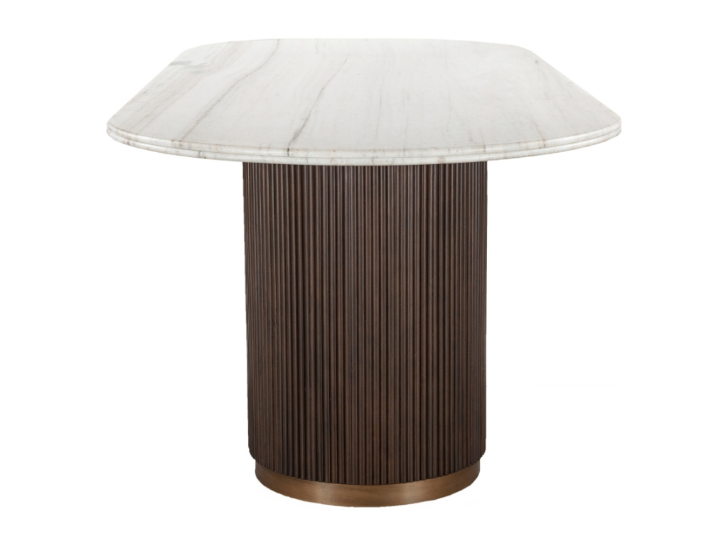 Jídelní stůl Mayfield kombinuje luxus mramoru s moderní elegancí. Oválná mramorová deska je harmonicky doplněna půlkruhovou podnoží s lamelovou texturou doplněnou o stylový mosazný detail, což vytváří unikátní vzhled. Tento stůl se stane centrálním bodem každé jídelny. Ideální volba pro ty, kteří si potrpí na kombinaci kvalitních materiálů a prostorově výrazného designu.