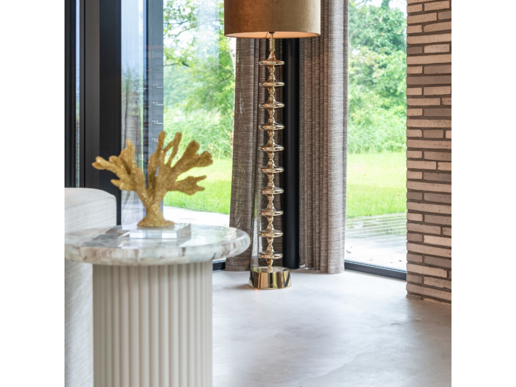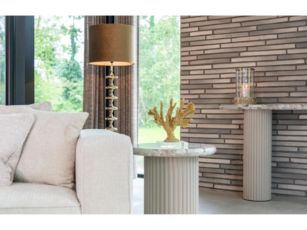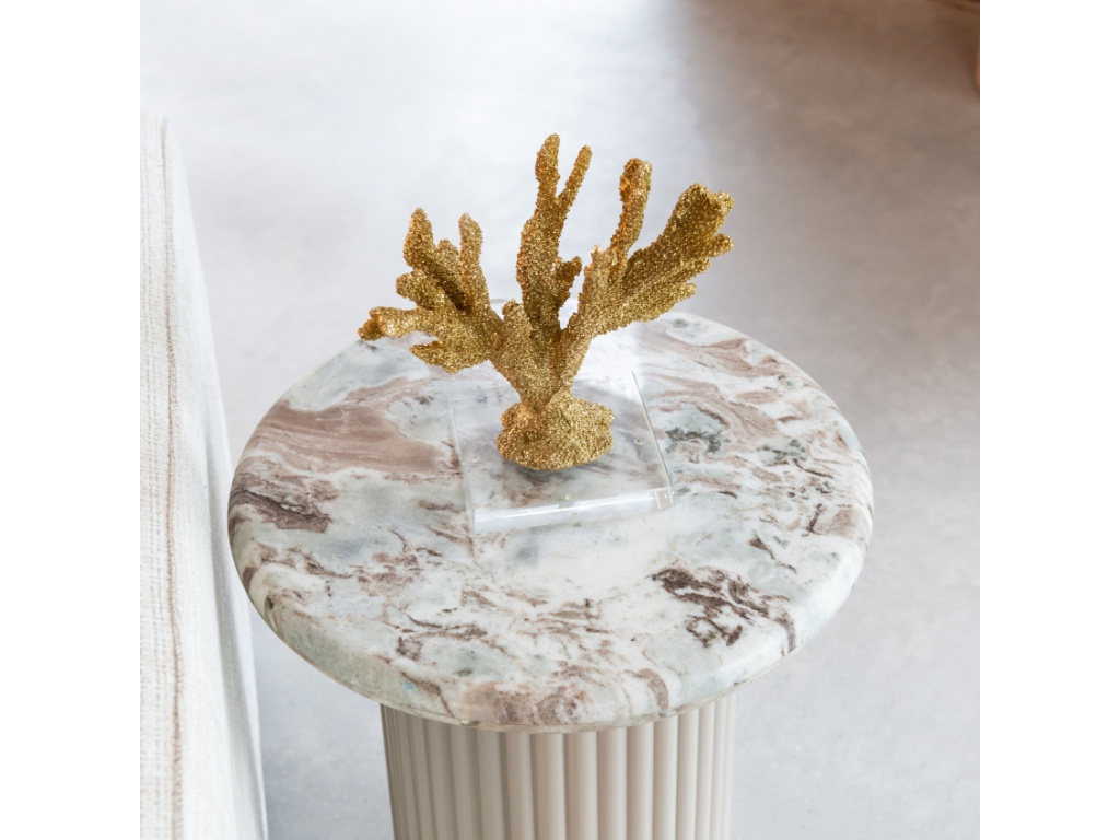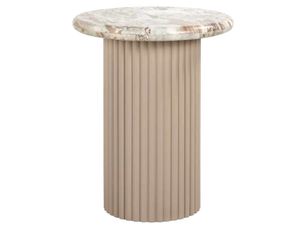 Malý, ale výrazný. Odkládací stolek Coronel vás okouzlí svou kombinací elegance a praktičnosti. Kulatá deska z torontského mramoru s jemným béžovohnědým vzorem bude krásně ladit s neutrálními i teplejšími tóny interiéru. Válcová podnož s vertikálním žebrováním přidá prostoru hloubku a architektonický nádech. Perfektní doplněk vedle pohovky na odložení knížky či šálku čaje nebo jako elegantní noční stolek do ložnice. Snadno se stane nepostradatelnou součástí vašeho domova.